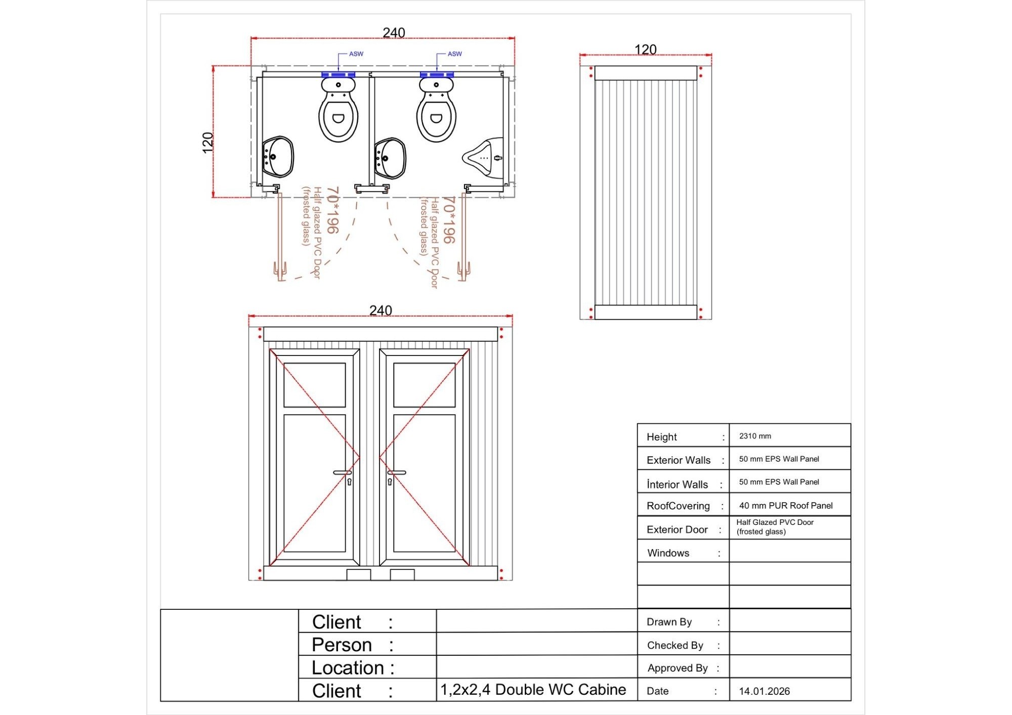 Doppel WC Container - 2 mal WC + 1 mal Pissoir, Maße 240 cm mal 120 cm, mal 229 cm Höhe, Farbe anthrazit, inkl. Beleuchtung, Spiegel, 2 mal WC, Pissoir, Waschbecken, Sicherungskasten, Lichtschalter, Steckdose, NEU