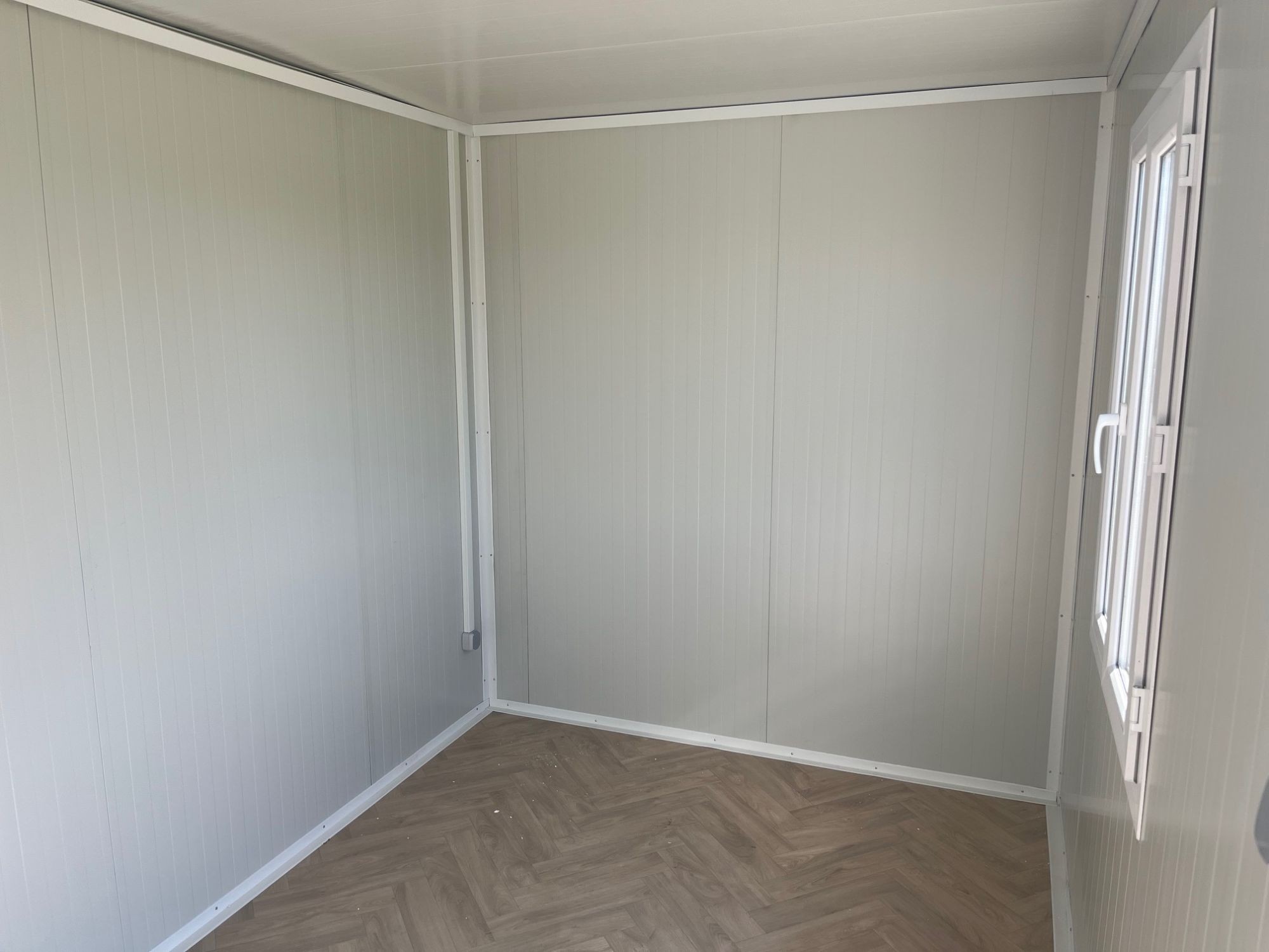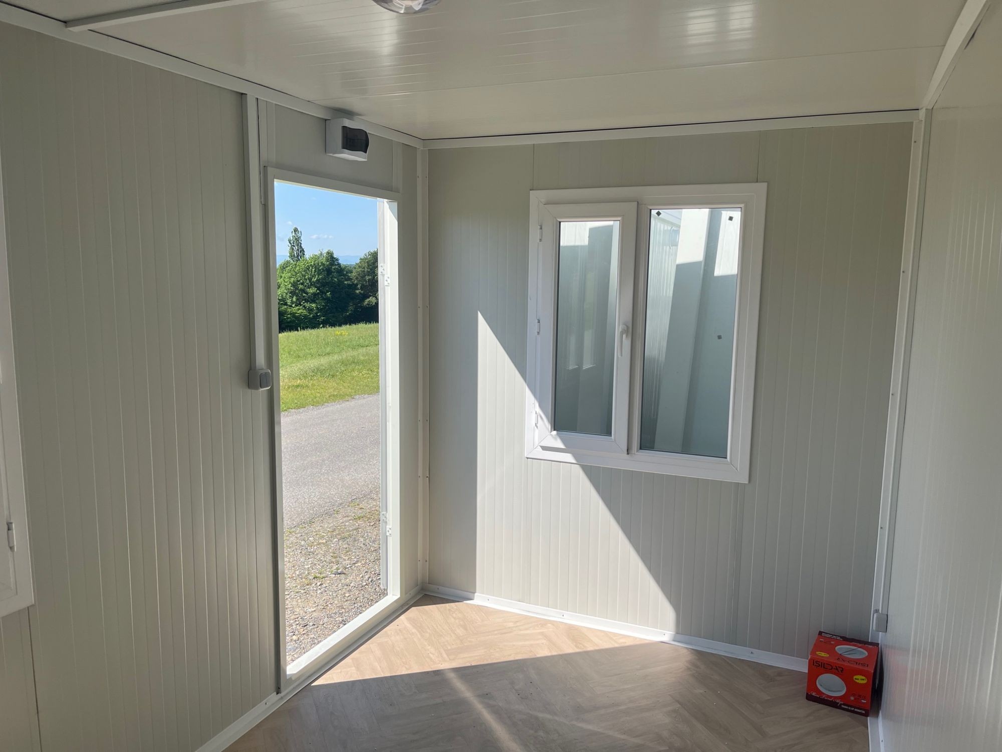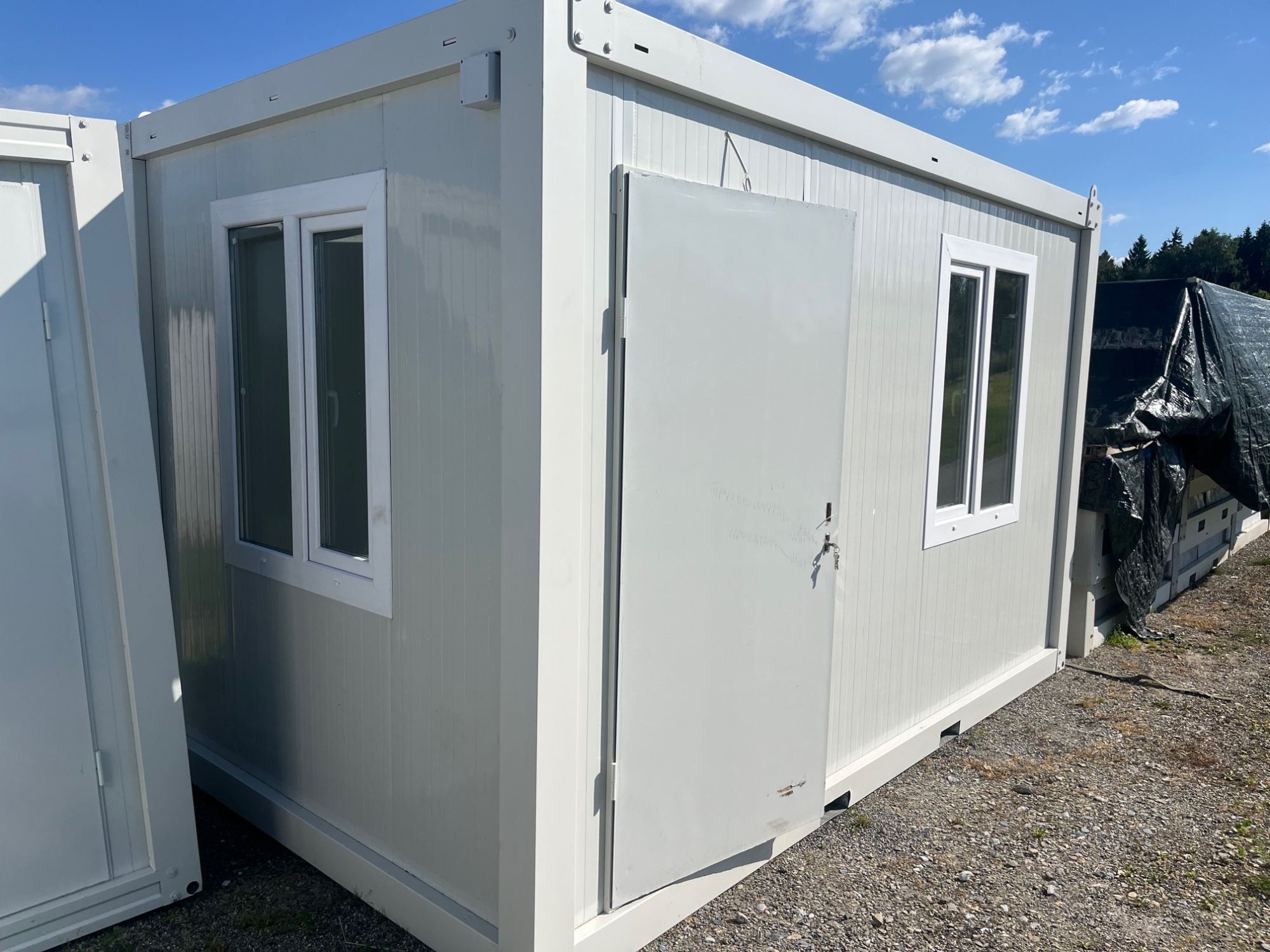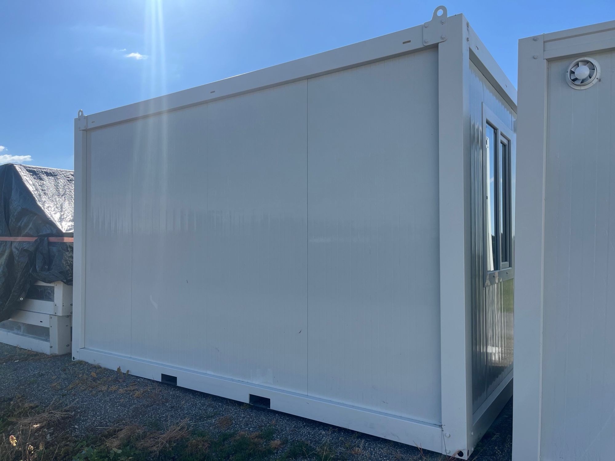 Bürocontainer Länge 4 m Breite 2,4 m Höhe 2,54 m, Paneele 5 cm PU, Farbe weiß, inkl. Beleuchtung, 1 Stk. Tür, 2 Stk. Fenster, Kabelkanal, Kabel, Sicherungskasten, Steckdose, Lichtschalter, im Flatpack (Boden und Dach bereits fertig montiert, Paneele, Tür, Fenster noch zu montieren)