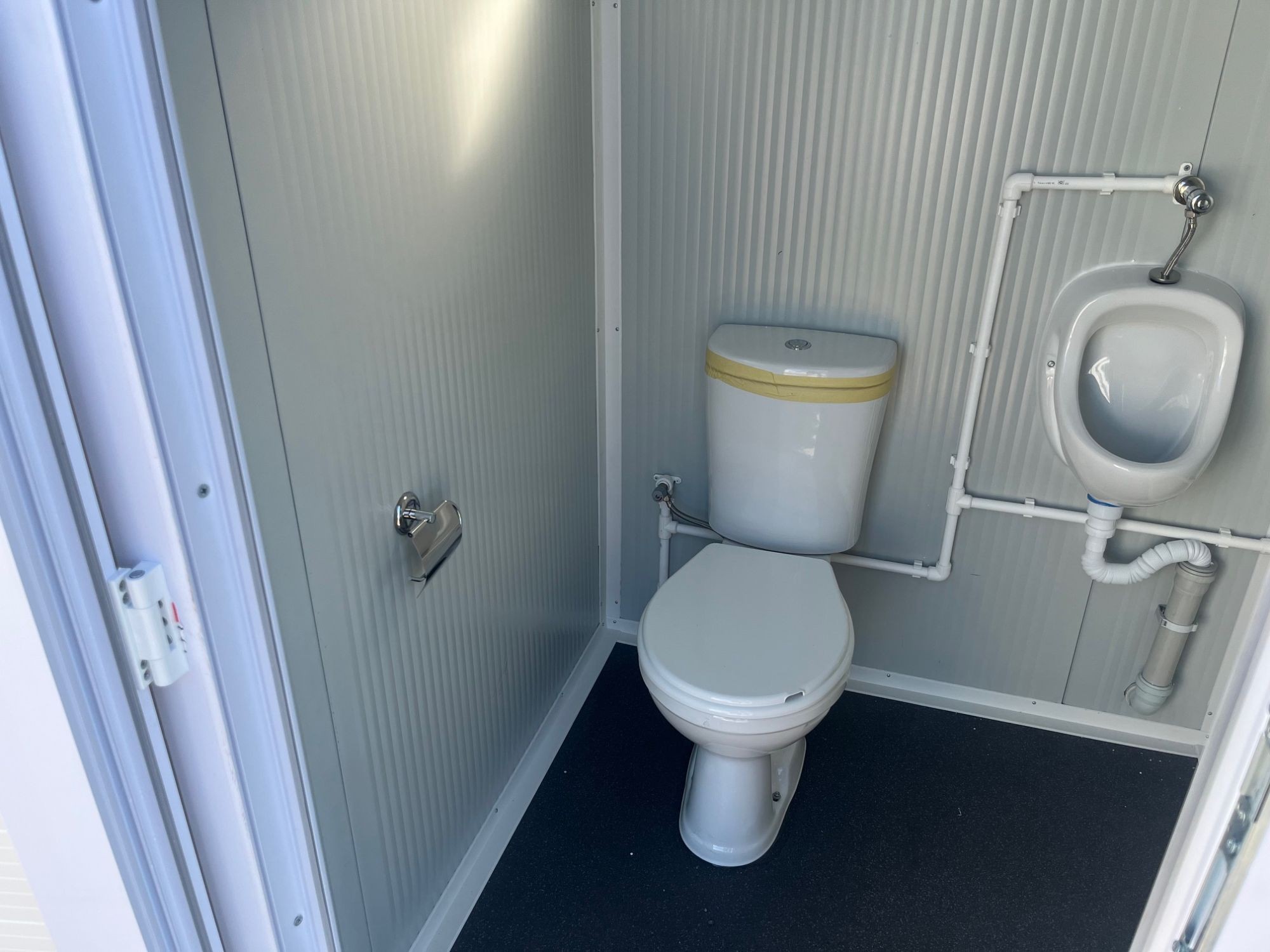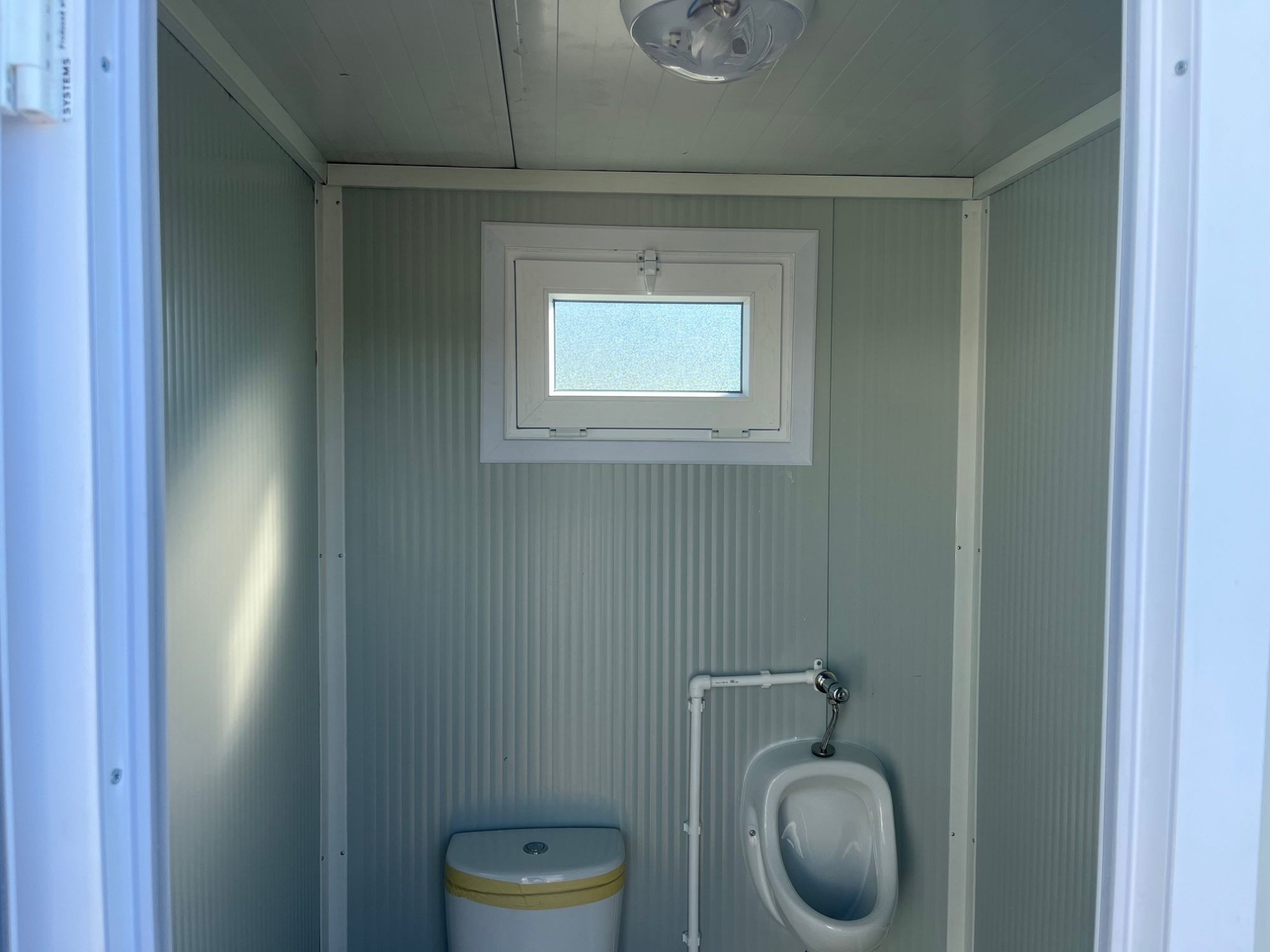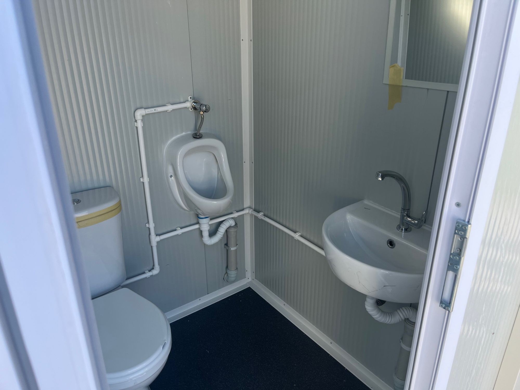 WC-Container, Farbe weiß, Maße: 145 cm mal 145 cm mal 230 cm Höhe, inkl. WC, Pissoir, Waschbecken, Lampe, Spiegel, Rollenhalterung,