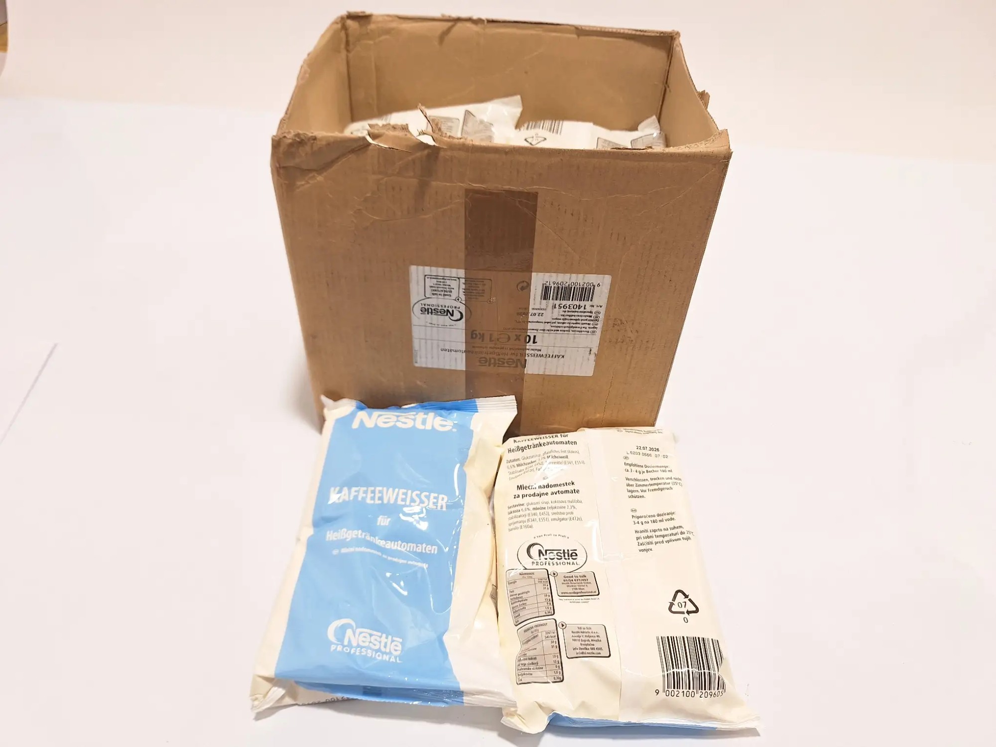 Je 1.000 Gramm für Hei­ß­ge­trän­ke­au­to­ma­ten. Min­dest­halt­bar­keits­da­tum: 22.07.2026