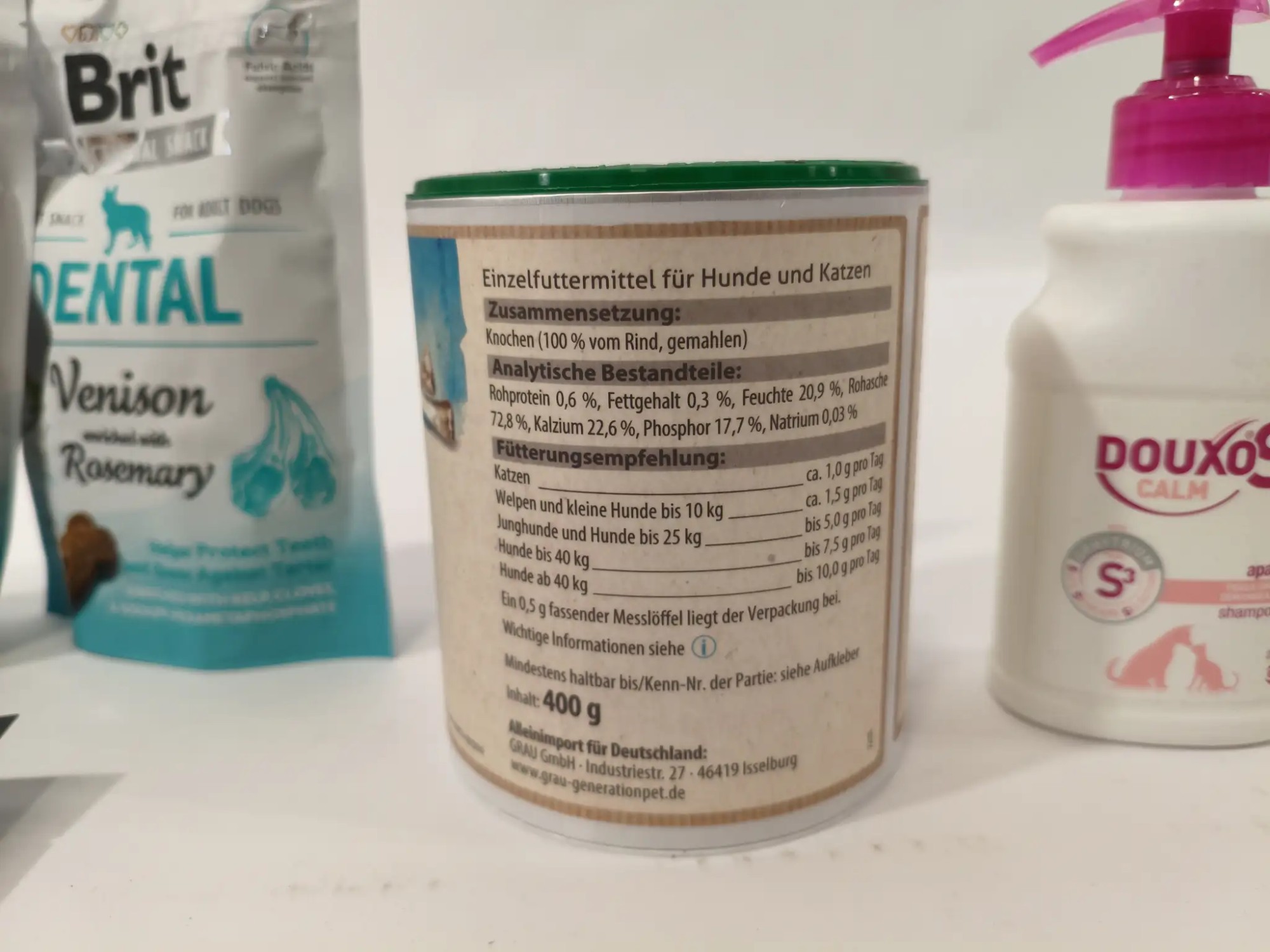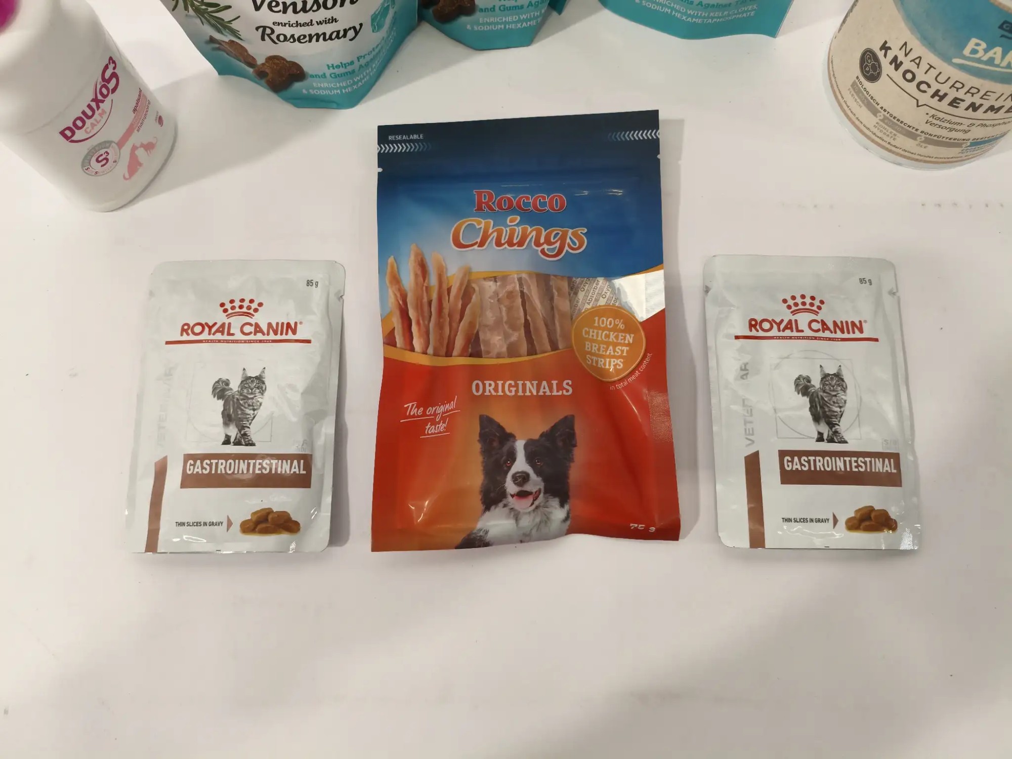 3x Brit Dental Venison (MHD: 03/2027), 2x Royal Canin Gastrointestinal (MHD: 09/2027), 1x Rocco Chings (MHD: 06/2027), 1x Bard Knochenmehl (MHD: 12/2026), Shampoo