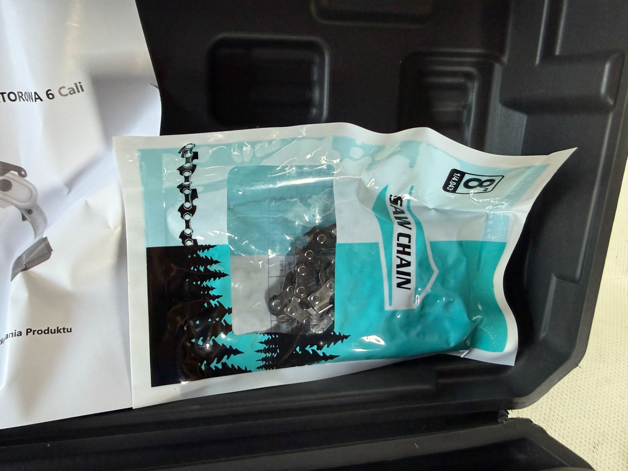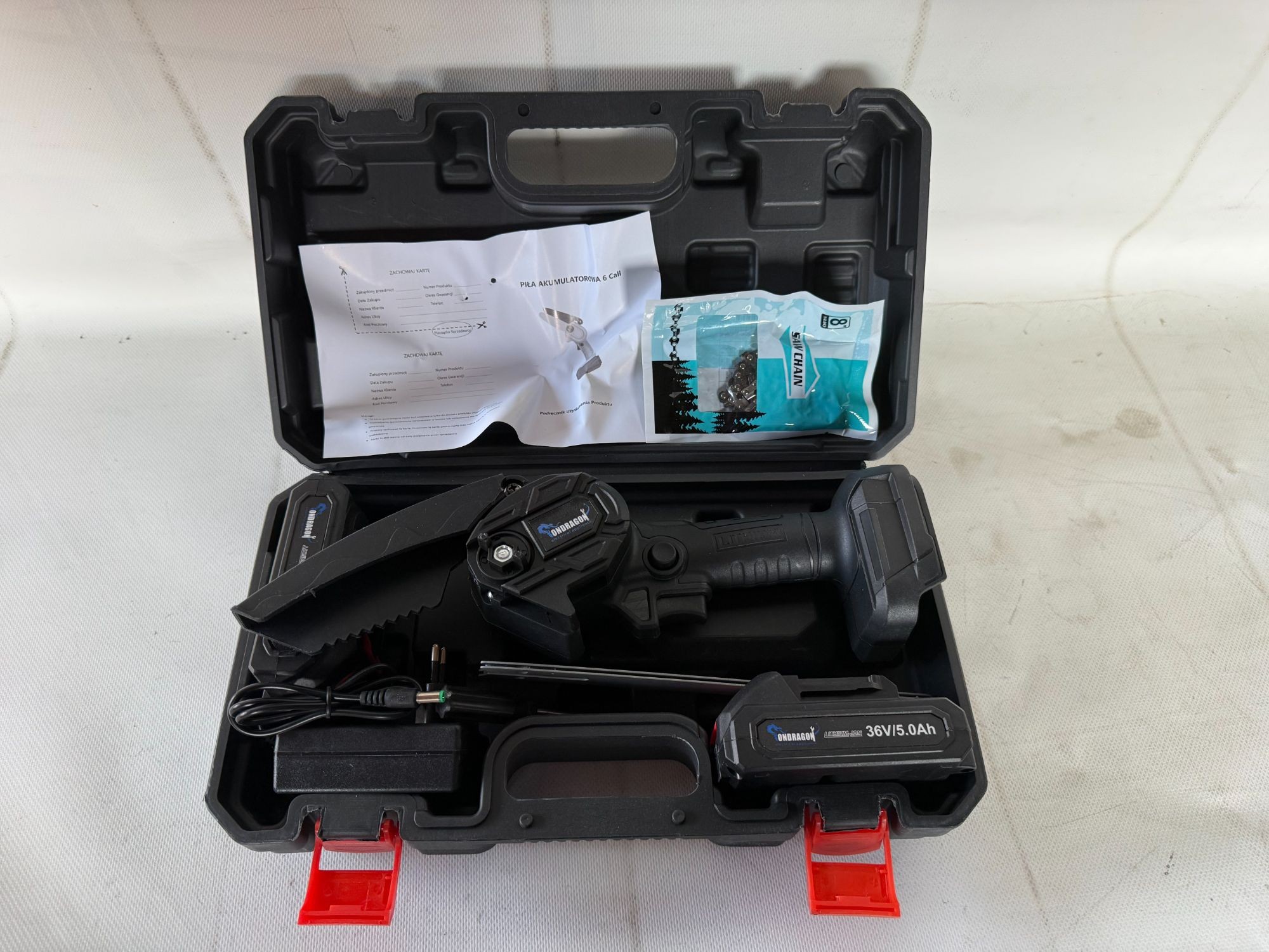 samt 2 Stk Ak­kus 36V, 5Ah, 1x La­de­ge­rät, 1x Schwert, 1x Ket­te