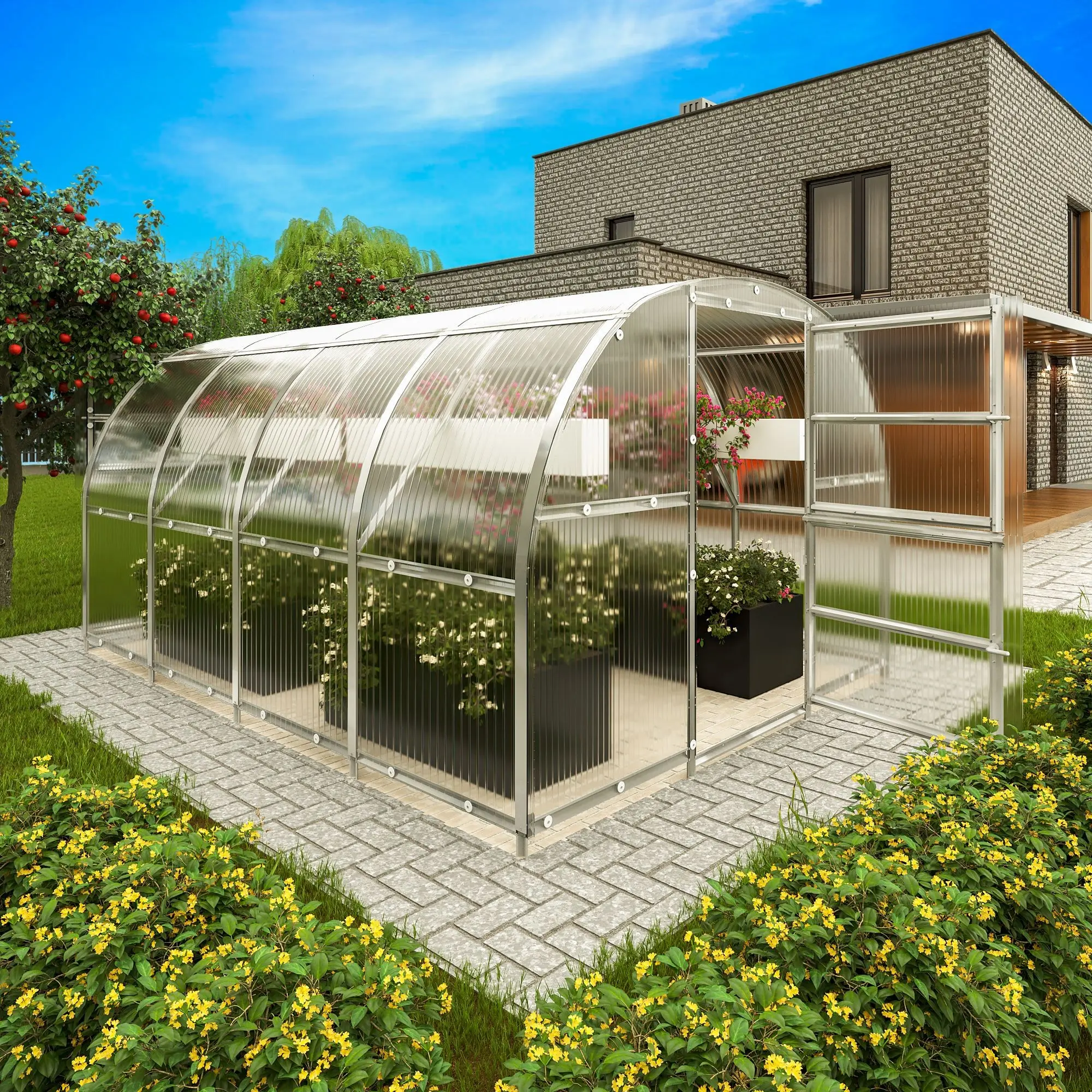 1 Stk. Gewächshaus, Treibhaus aus Stahl und Hohlkammerplatten. Stabile Stahlkonstruktion - galvanisiert - 400 x 300 x 210 (L x B x H). Standardgröße - teilbare Tür, Fundamentrahmen ist nicht nötig - 4 mm Hohlkammerplatten für perfekten Ertrag - hohe Schneelast, da das Gewächshaus rund ist - inklusive 3D-Aufbauplan