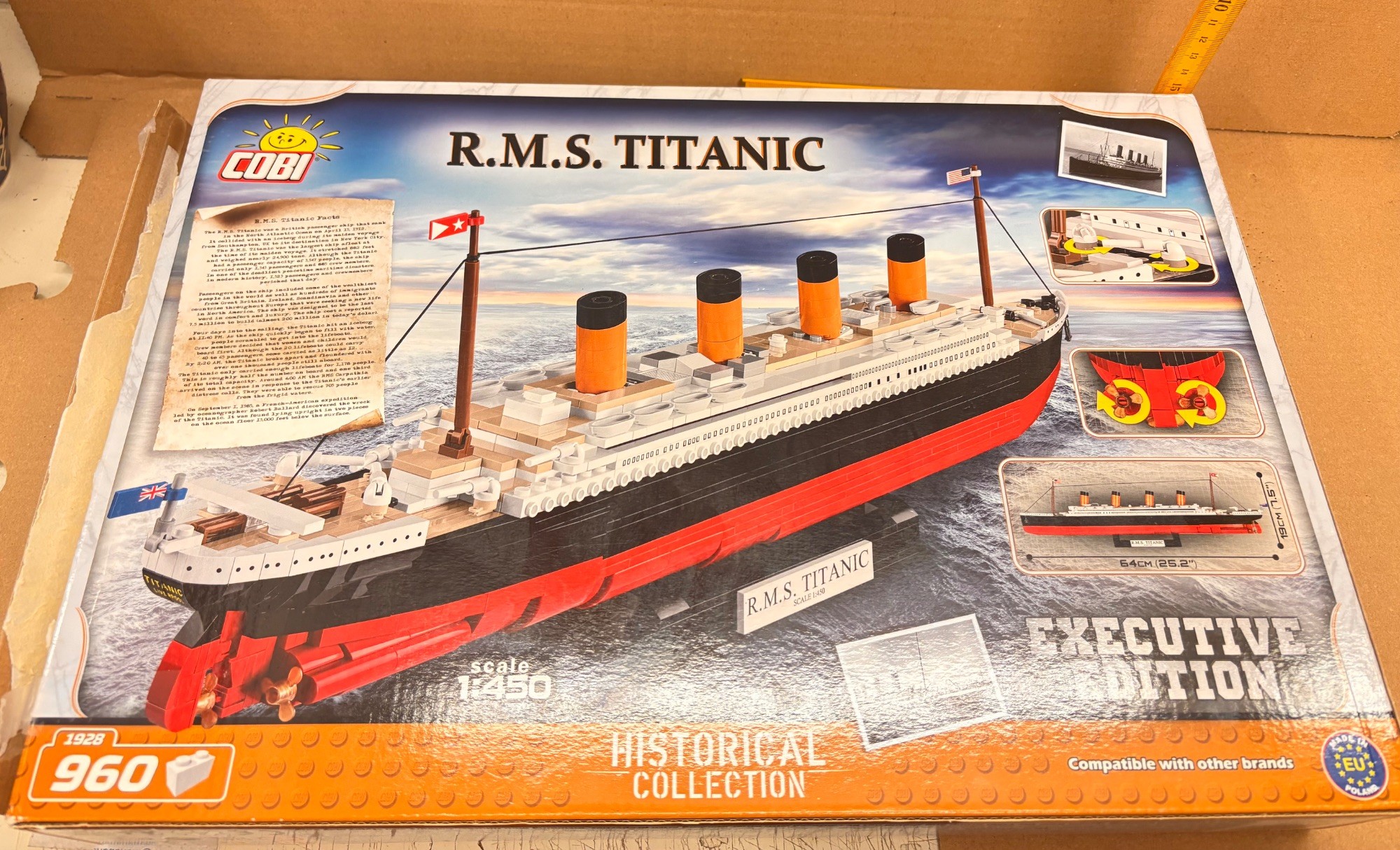 COBI 1928 - TITANIC Executive Edition zusammengebaut! Die R.M.S. TITANIC ist das wohl bekannteste Schiff, das jemals über die Weltmeere gefahren ist. Das Modell des Schiffes besteht aus 960 Klemmbausteinen und ist 64 cm lang sowie 19 cm hoch. Das Modell ist im Maßstab 1:450. Dank der bedruckten Elemente und der Liebe für Details spiegelt das Modell das Erscheinungsbild des realen Vorbildes originalgetreu wider. Während seiner ersten Jungfernfahrt in der Nacht vom 14. auf den 15. April 1912 auf der Strecke Southampton-Cherbourg-Queenstown-New York kollidierte der britische Ozeandampfer R.M.S. Titanic mit einem Eisberg und sank. Dieser Unfall ist eine der bekanntesten Seekatastrophen und weckt immer noch große Emotionen. Während der unglücklichen Reise befanden sich ungefähr 2.228 Menschen auf dem Schiff. Es war 268,99 Meter lang und 29,41 Meter breit. Es war zu Beginn des 20. Jahrhunderts ein wahres Wunder der Technologie. Das Blockmodell des Schiffes besteht aus 960 COBI-Bausteinen. Im Bau ist es 64 cm lang und 19 cm hoch. Zahlreiche Details sowie das Erscheinungsbild seines legendären Vorbildes werden im Maßstab 1:450 reproduziert. Das Set enthält bewegliche Teile. Sie können beispielsweise Kräne, Schrauben und Ruder bewegen. Das Handbuch verwendet ein System einfacher Symbole und Piktogramme, die Sie leicht durch den Bauprozess führen. Das Blockmodell der Titanic muss nicht geklebt oder lackiert werden. Alle Grafiken und Beschriftungen werden in Form von sehr haltbaren Drucken auf die Blöcke aufgebracht, die sich unter dem Einfluss von Sonne, Wasser oder sogar sehr intensivem Spiel nicht abnutzen oder verblassen. Im Modell wurden keine Aufkleber verwendet. Das Set ist Personen über 8 Jahren gewidmet. Es wird sicherlich sowohl den jüngsten Fans von Blöcken als auch der Erwachsenengeschichte und Meeresliebhabern viel Befriedigung bringen. Das R.M.S. Titanic-Modell wird sowohl auf dem Sammlerschreibtisch als auch im Zimmer jedes Teenagers und Kindes mit Sicherheit spektakulär aussehen.