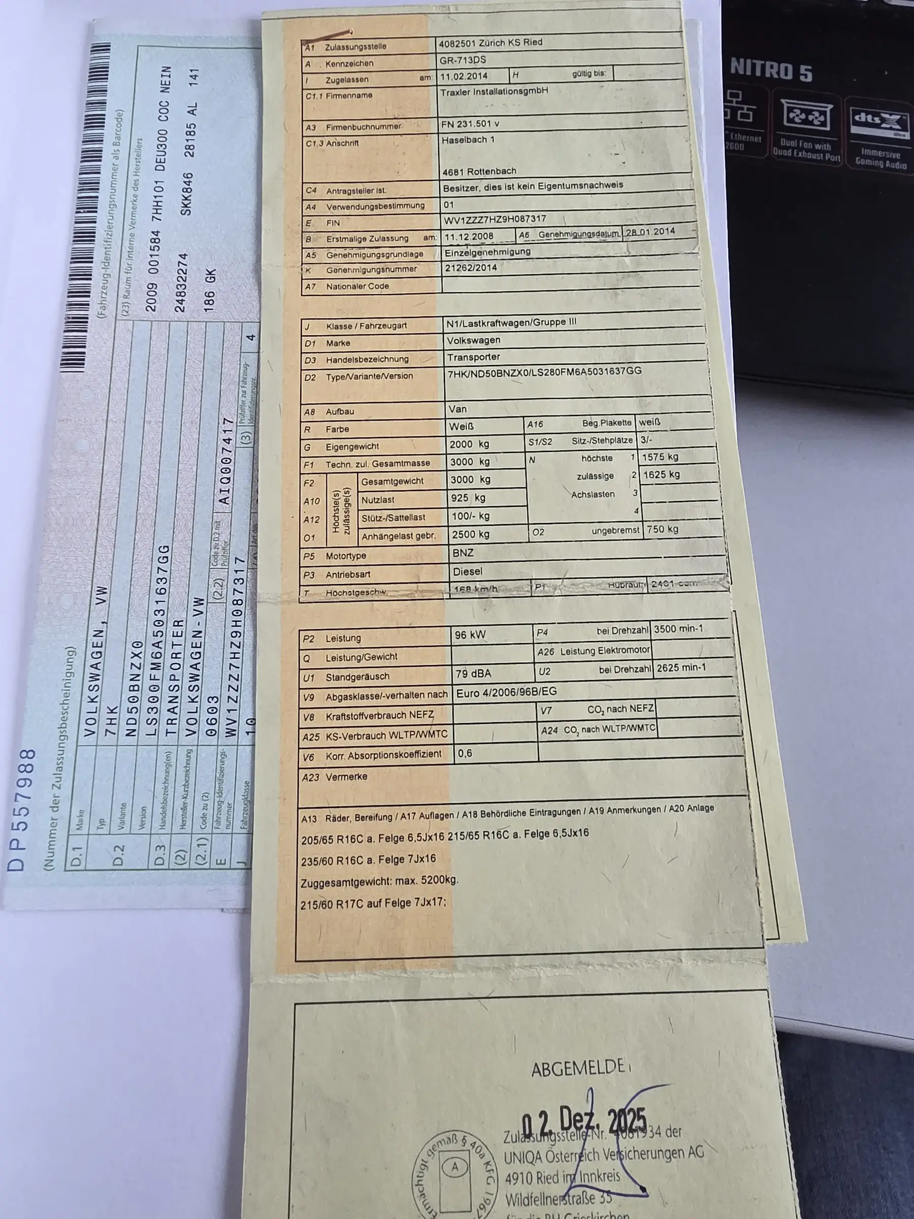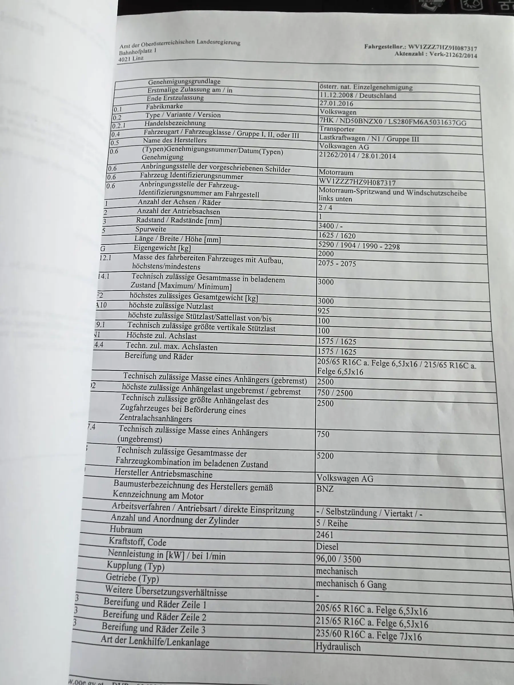 VW T5 Kastenwagen, 2.5 TDI, Farbe: weiß, Leistung: 96 kW (130 PS), Eigengewicht: 2000 kg, Gesamtgewicht: 3000 kg
