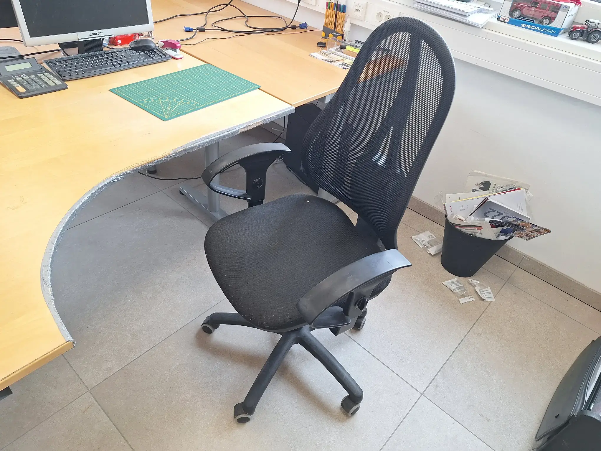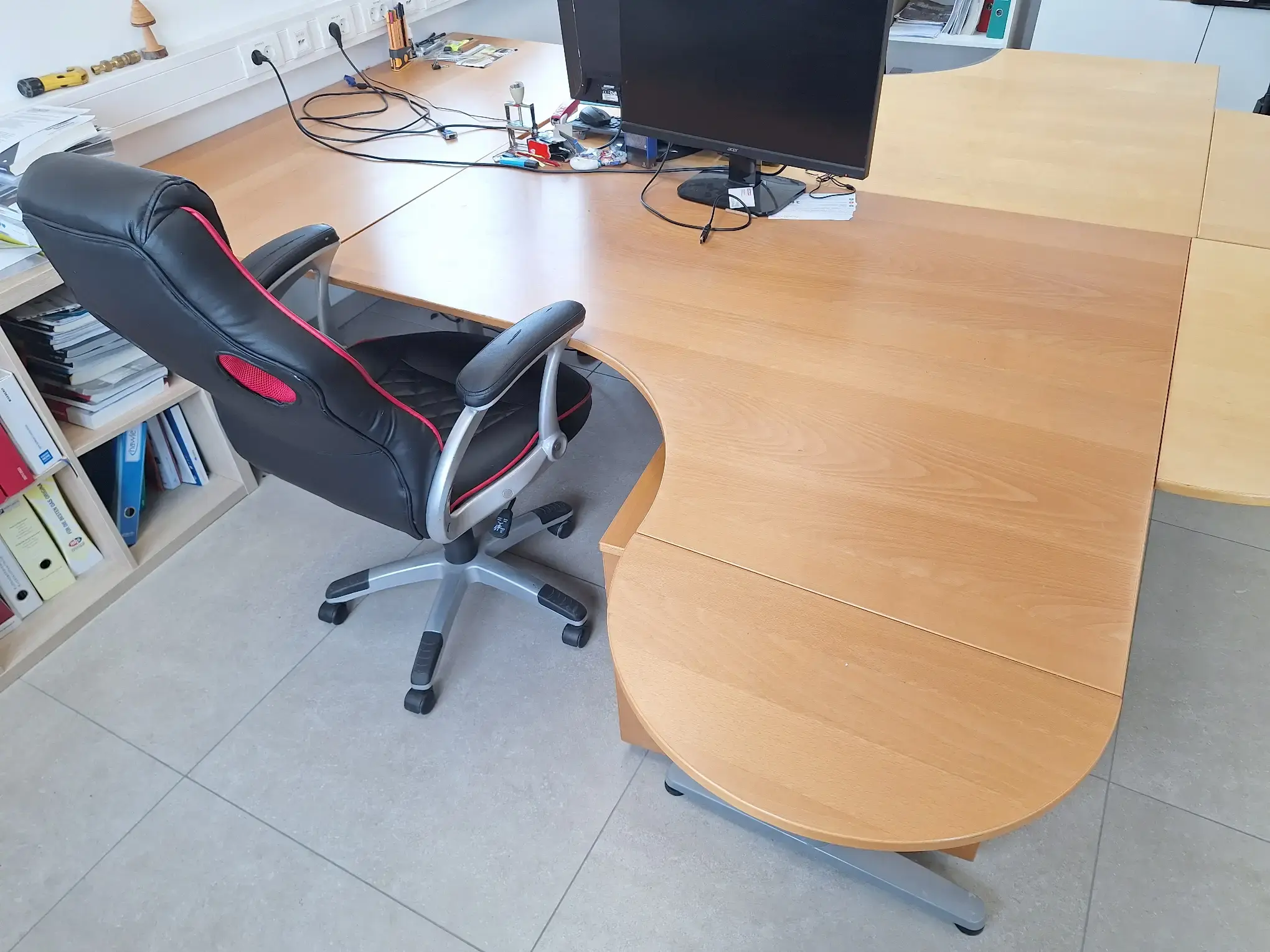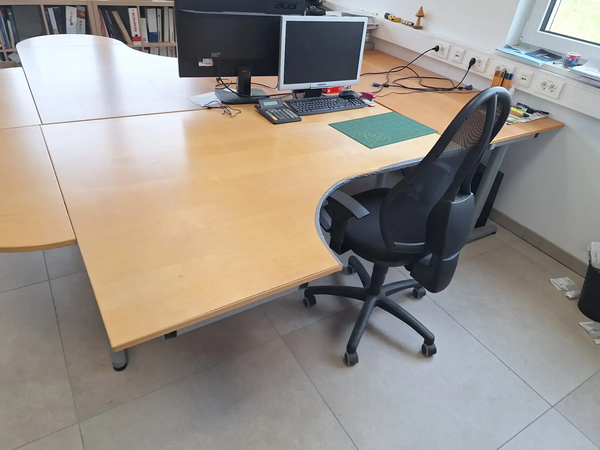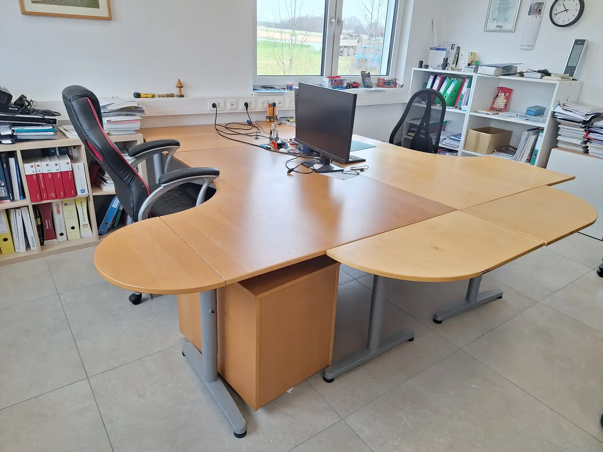 Inkl. 2 Stüh­le und Roll­con­tai­ner, ex­cl. In­halt, Bild­schir­me, Tas­ta­tur und Maus, Ge­samt­maß 280x270x74 cm
