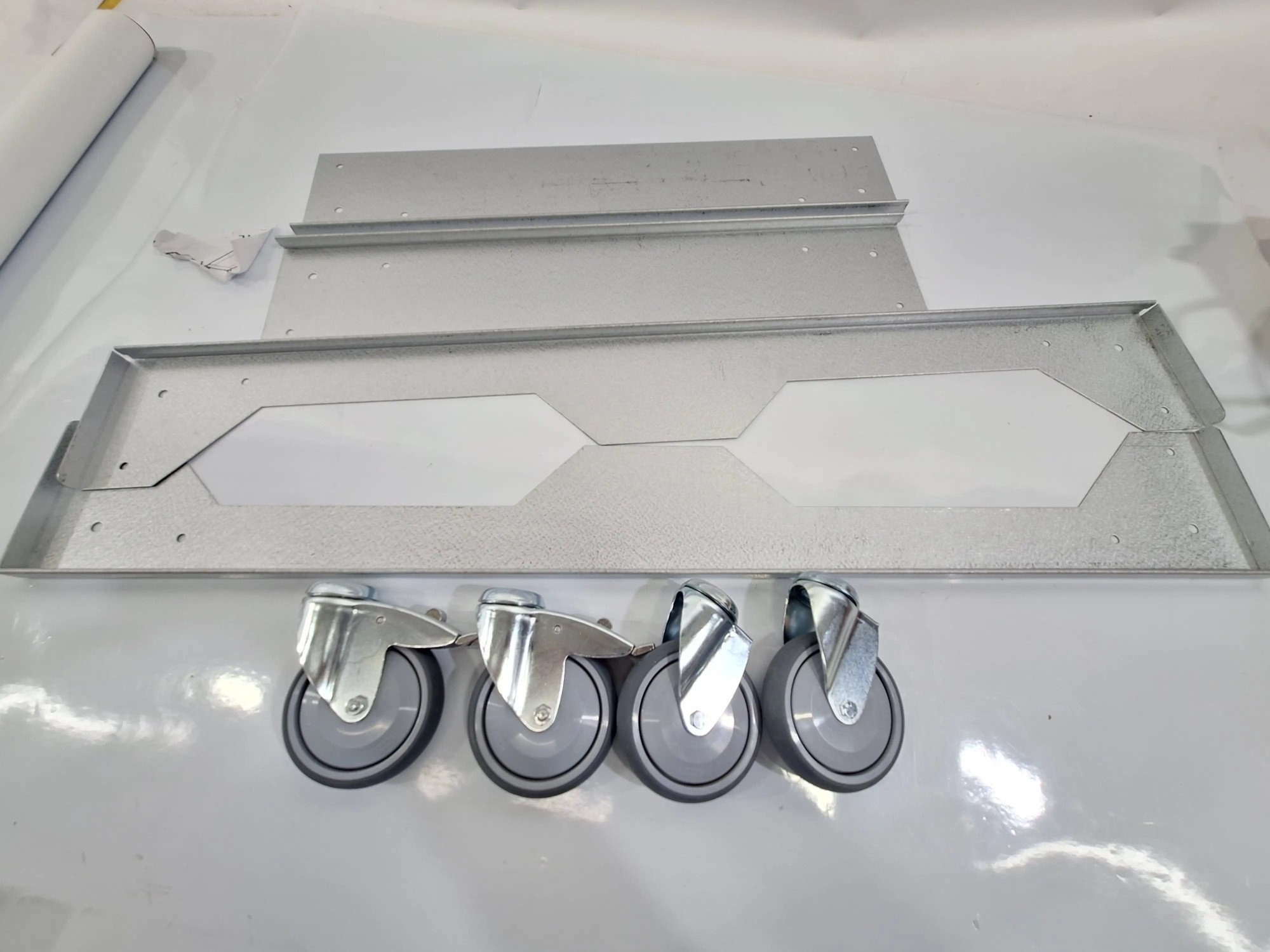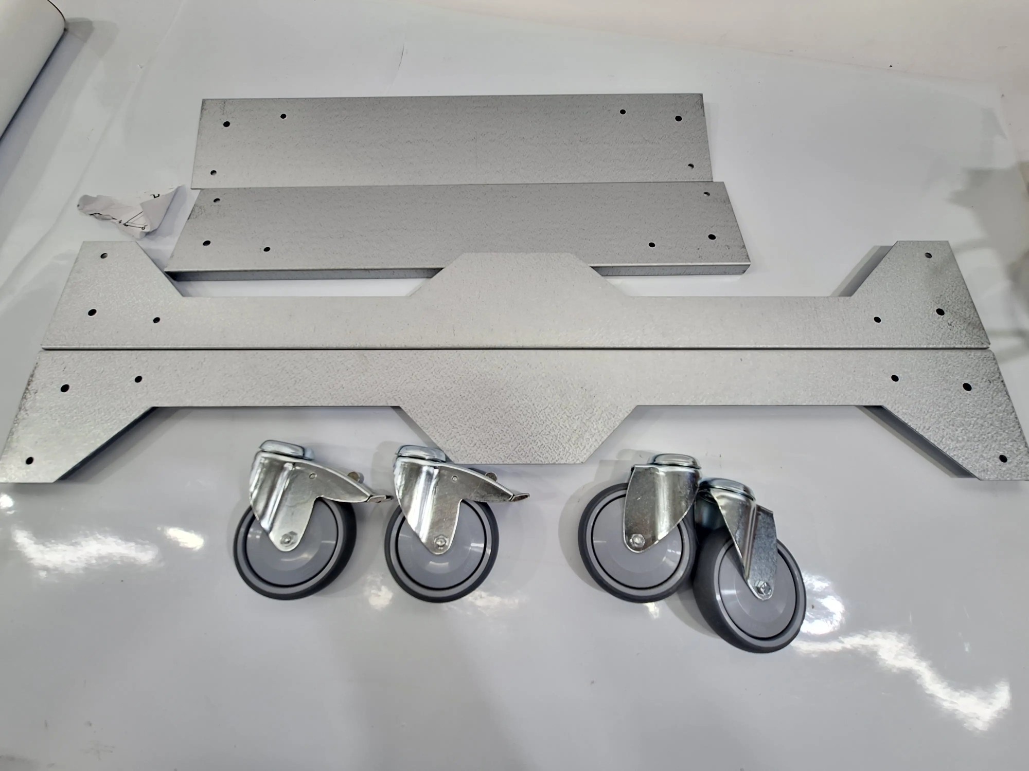 KM217F, 2x Längenstücke Länge ca. 123 cm, 2x Breitenstücke Länge ca. 81 cm, 4x Raddurchmesser ca. 13 cm, (Schrauben & Montageanleitung fehlen bzw. beschädigt)
