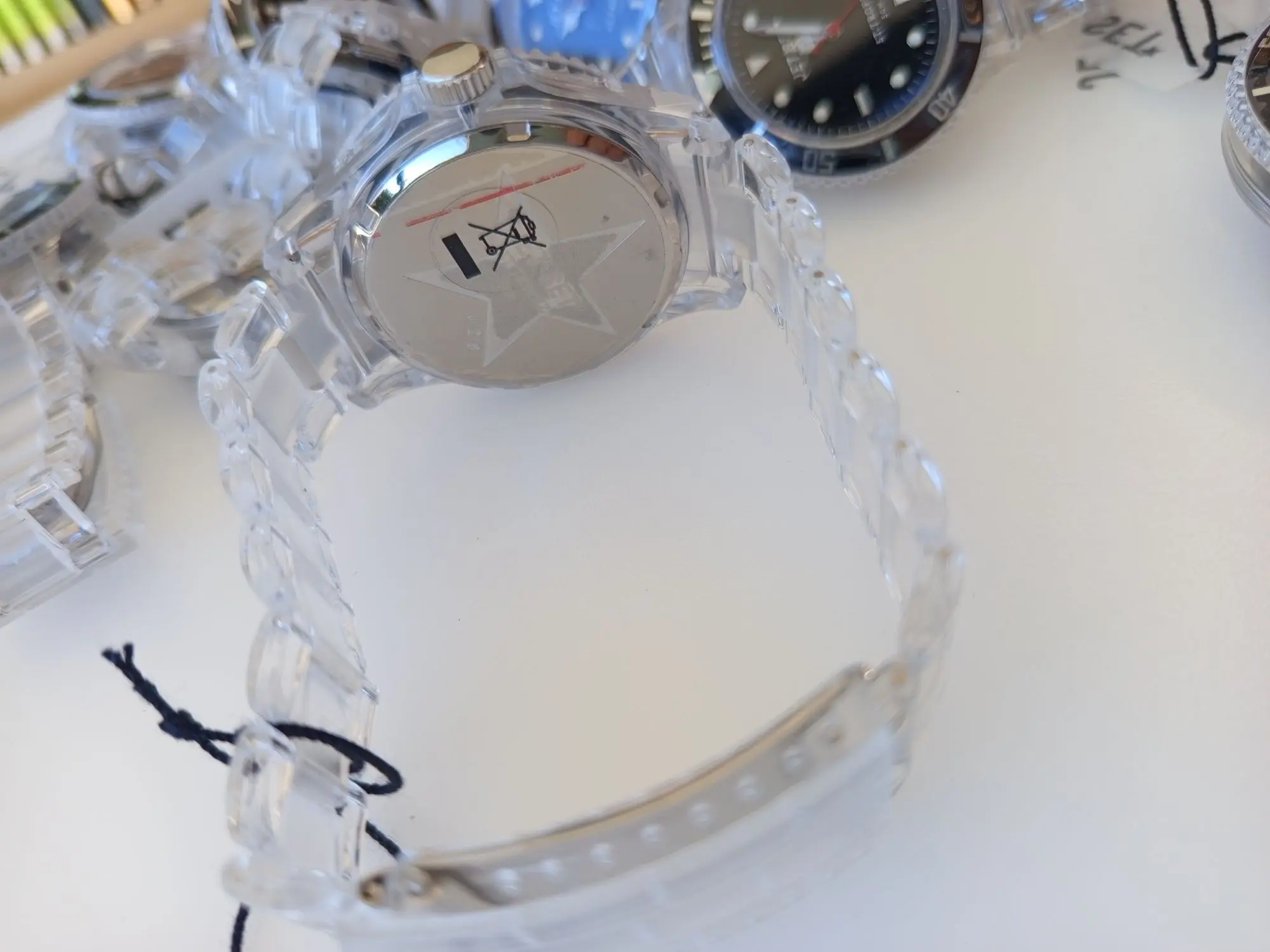 069 Ehemaliger VP in der Schweiz 479 CHF (47,90 CHF/Stück). Sie erhalten 10 Stück. 1 Uhr befindet sich in der OVP, 9 Uhren werden ohne Verpackung geliefert. Die Batterie (AG4) ist leer. Die Uhren stammen aus der Sortimentsauflösung der Handelskette Migros Schweiz. Preis ausgezeichnet in CHF. Daten: Uhrwerk: Miyota Quarzwerk Zeitanzeige: Analoges 3-Zeiger-Zeitsystem Leuchtzeiger und Indizes Lünette nicht drehbar mit Leuchtpunkt auf der 12 Gehäuse: Polycarbonat (transparent) Armband: Polycarbonat (transparent) mit Faltschließe Kratzfestes Mineralglas Wasserdicht: Dieses Modell ist wasserdicht bis 50 Meter Größe: 40 mm Durchmesser, 18 mm hoch dank Polycarbonat extrem leichtes Gewicht. Neuware