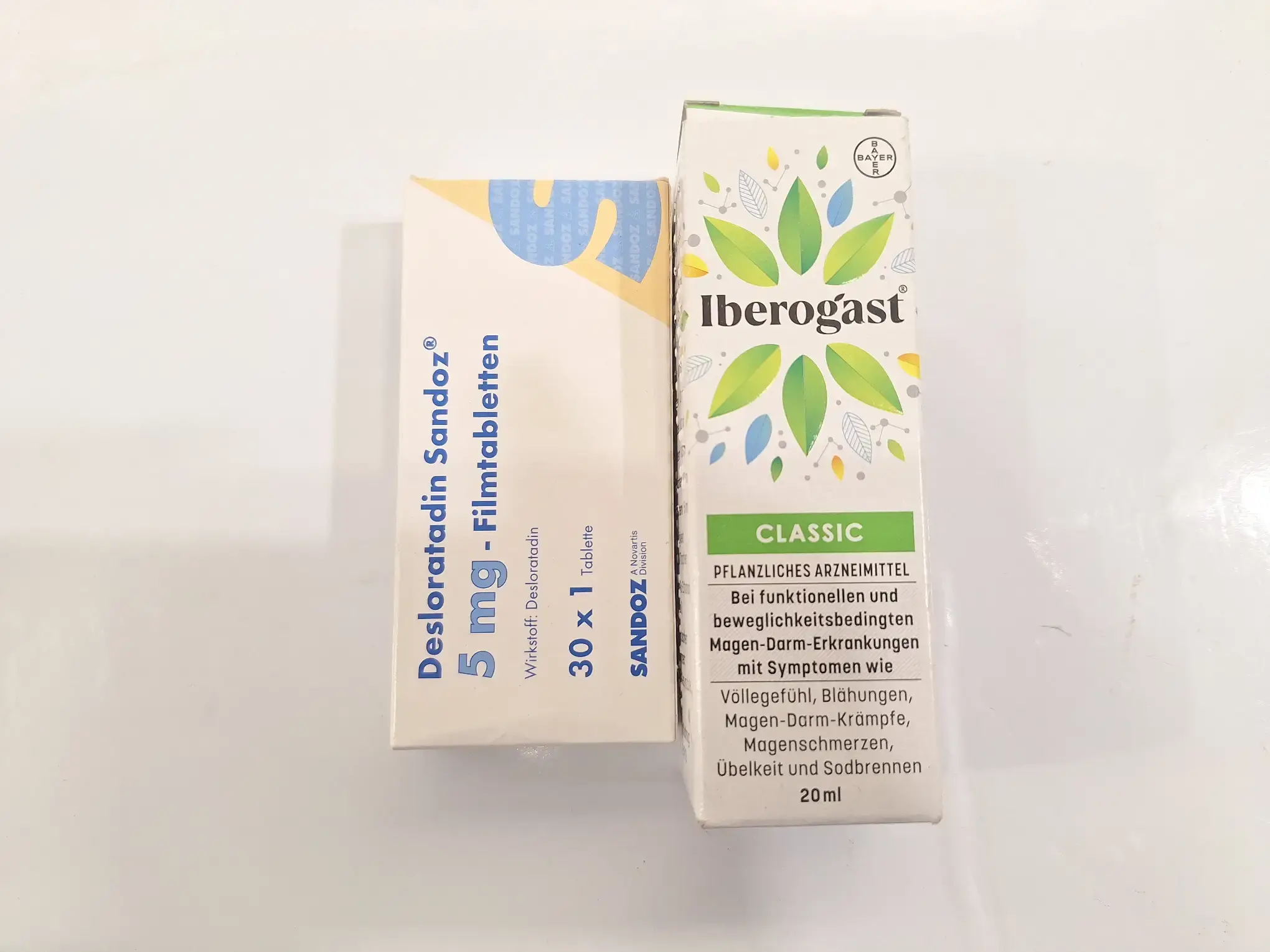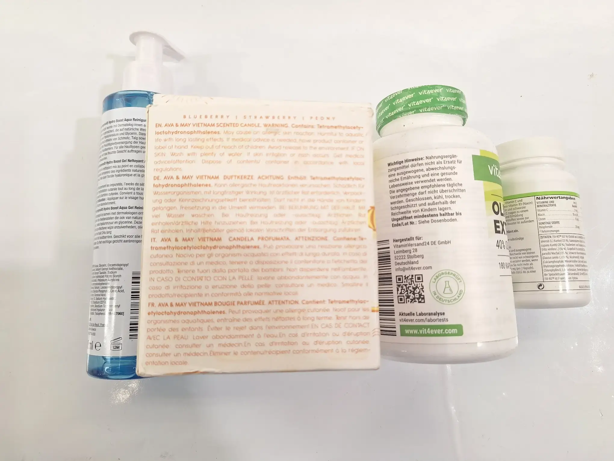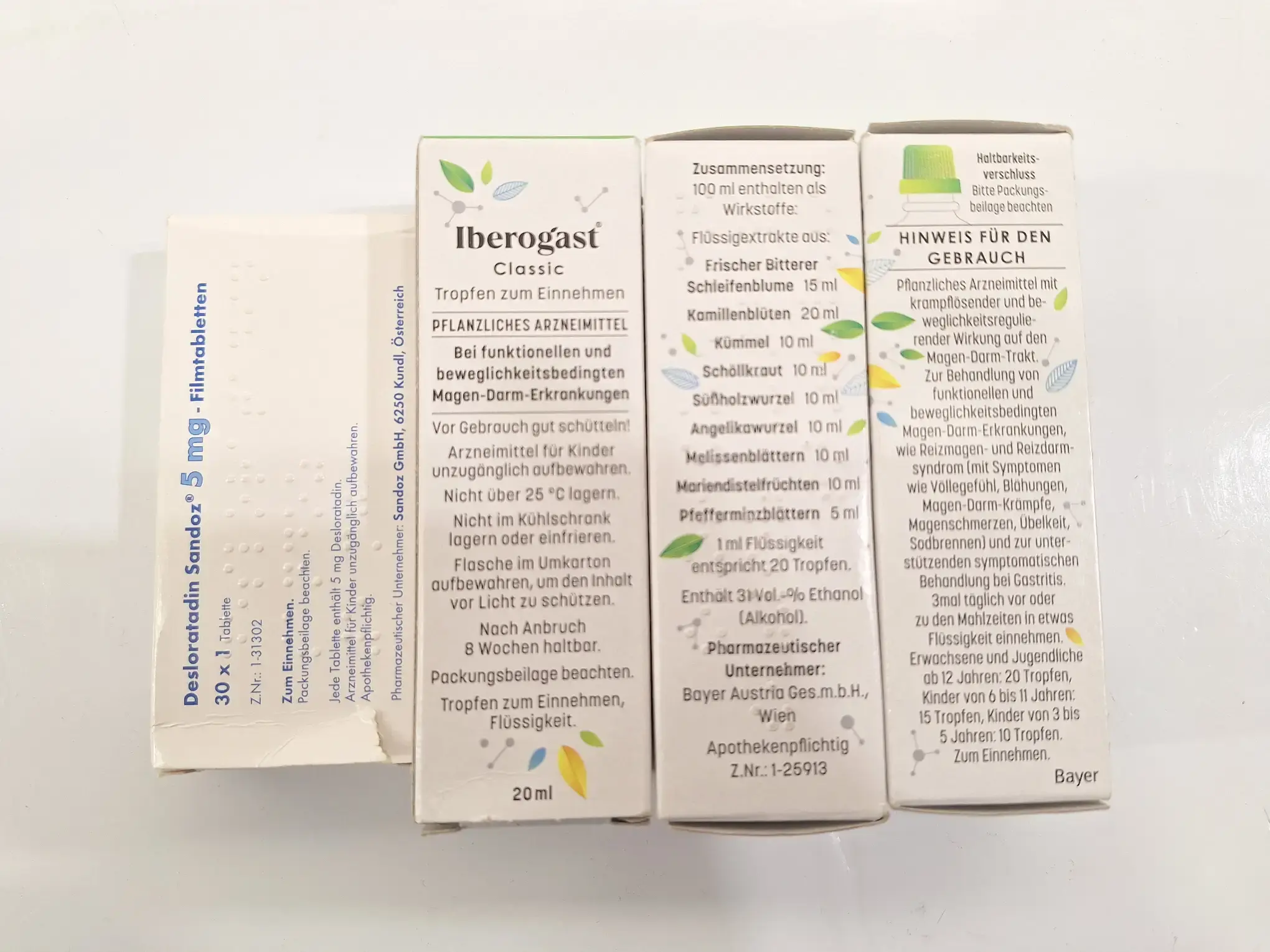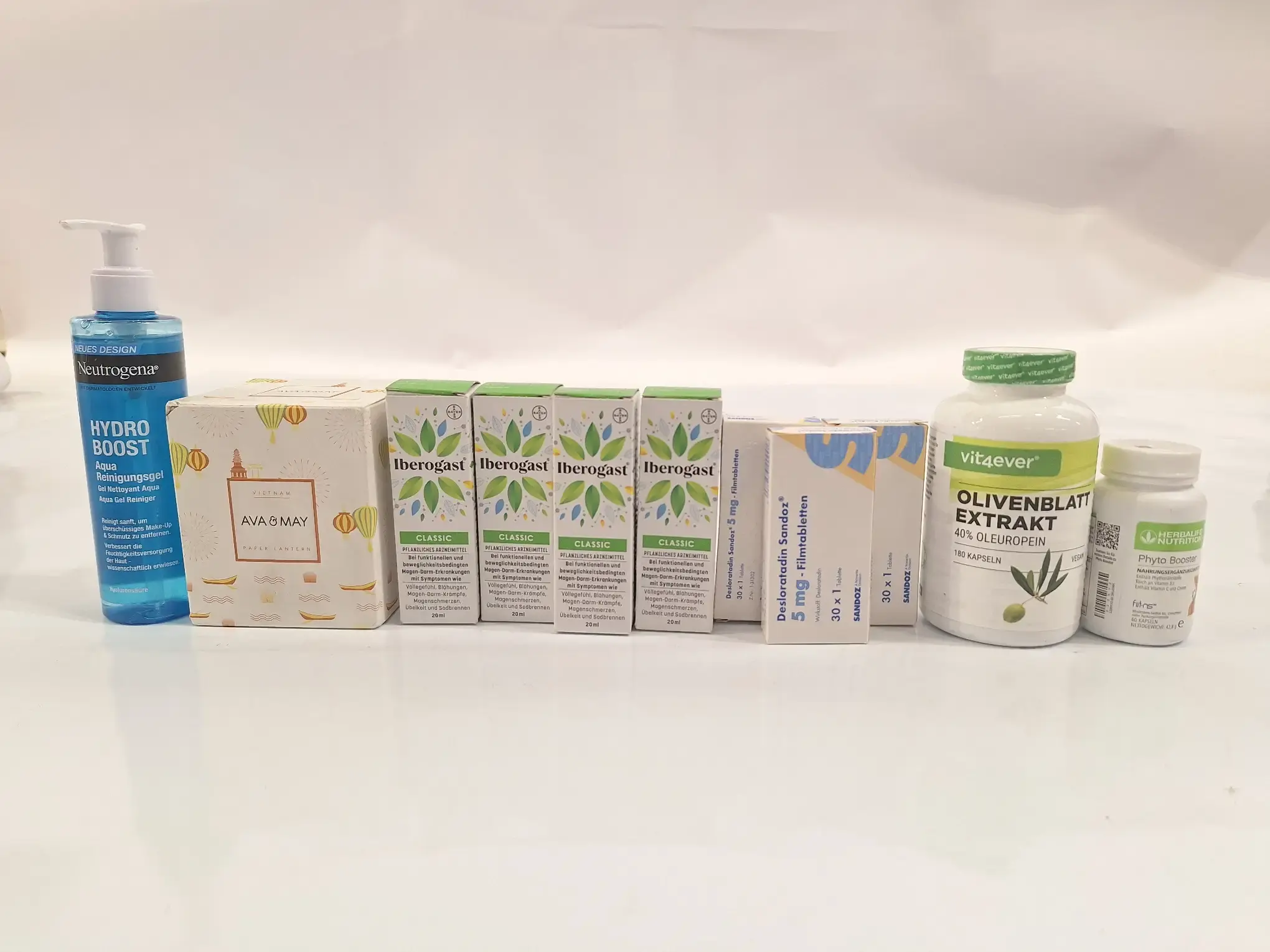 3 x Desloratadin Sandoz, je Schachtel 30 x 1 Tablette 5 mg (MGD: 03/2028), 4 x Iberogast Magen Darm Tropfen je 20 ml (MHD: 09/2026), 1 x PhytoBooster 42,8 g (MHD: 29.05.2027), 1 x Olivenblatt Extrakt 140 g / 180 Kapseln (MHD: 03/2027), 1 x Duftkerze, 1 x Makeup-Entferner 200 ml