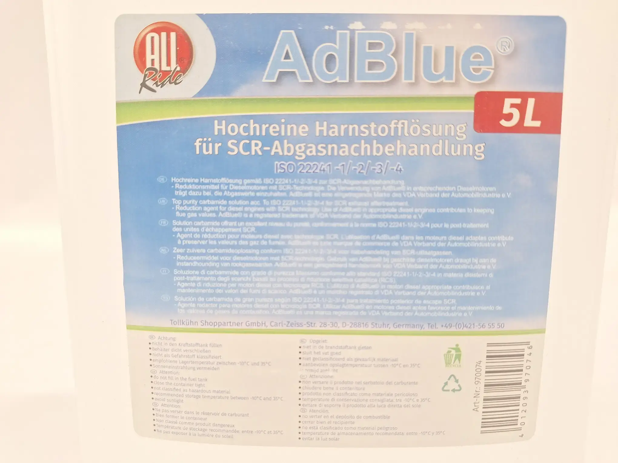 Hochreine Harnstofflösung für SCR-Abgasnachbehandlung, ISO 22241-1/-2/-3/-4, 5 Liter, Produktionsdatum: 09.07.2025