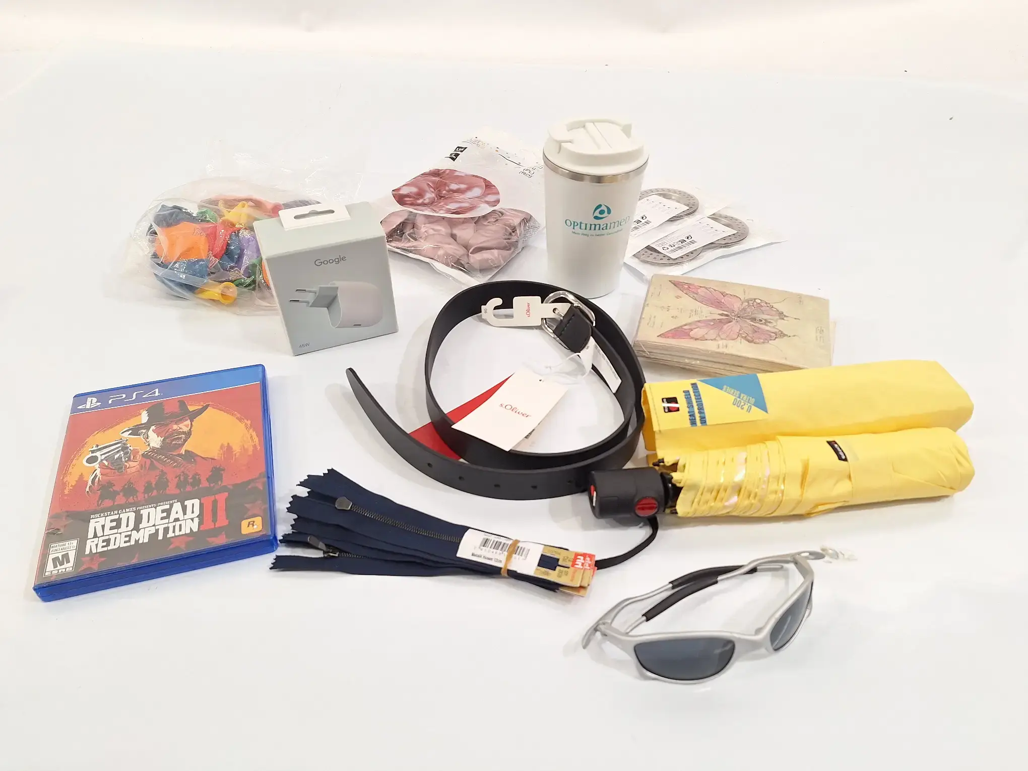 1xPS4 Spiel, 2xPackung Balloons, 1xRegenschirm, 1xGürtel Länge ca. 102cm, 1xNetzteil, 2xPackungen Postkarten, 1xTrinkbecher