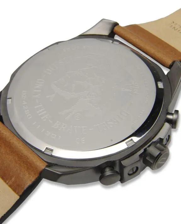 Neu OVP DZ4280 Ein batteriebetriebenes Quarzwerk sorgt für eine verlässliche Anzeige von Stunde, Minute, Sekunde und Datum und steuert die Chronographenfunktion, die 1/10 Sekunden und Sekunden bis zu 60 Minuten stoppt. Das weiße Zifferblatt hat Indexe und eine vollständige Minuterie. Das ionenplattierte Gehäuse hat eine polierte Lünette und einen markanten Kronenschutz. Der geschraubte Gehäuseboden ist mit einem Diesel-only-the-Brave-Logo graviert und unterstützt die Wasserdichtigkeit bis zu einem Druck von 10 bar (100 Meter). Der Durchmesser des Gehäuses beträgt 51 mm, die Stärke 11 mm. Das hellbraune Lederarmband wird mit einer Dornschließe mit Logogravur geschlossen. Die Herrenuhren aus der DIESEL MEGA CHIEF Kollektion erhalten eine besondere Ausstrahlung durch ihren Gehäusedurchmesser. Dieser lässt Platz für ein Zifferblatt in Layeroptik, das detailreich und im Stil von Cockpit-Bordinstrumenten gestaltet ist. Der Kronenschutz ist das Markenzeichen der MEGA CHIEF Uhren, die sich durch ihren Military Look größter Beliebtheit erfreuen. Das weiße Zifferblatt bildet mit dem dunklen Gehäuse einen klaren Kontrast, das Armband schafft dabei eine farbliche Verbindung und rundet das Bild perfekt ab.