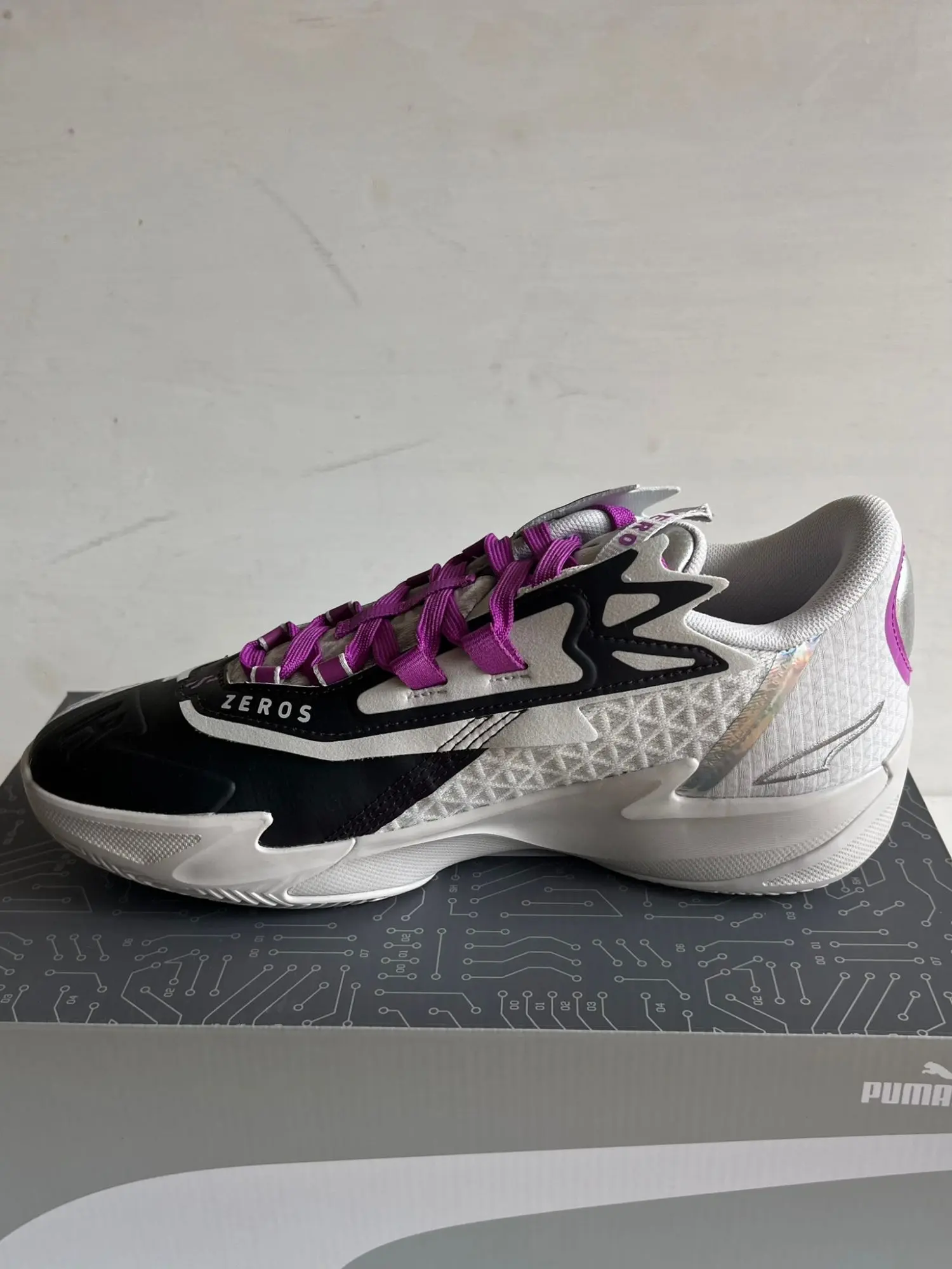 Sneaker - Hallenschuhe Unisex 311351-01 Neu OVP Der PUMA Stewie 4 Night Vision zeigt lebendige Farben, inspiriert von dem Phänomen des weißen Lichts, das durch ein Prisma gebrochen wird. Farbspritzer in Türkis und Fuchsia bedecken das blaue, technische Mesh-Obermaterial, das mit Schnürsenkeln gesichert ist, die durch kordierte Ösen geführt werden. Der Formstrip ist in Neonpink umrandet, passend zur textilen Krageninnenfütterung. Breanna Stewarts vierter Signature-Schuh ruht auf einer gesprenkelten PROFOAM-Mittelsohle, die aus einer hochprallen EVA-Verbindung besteht.