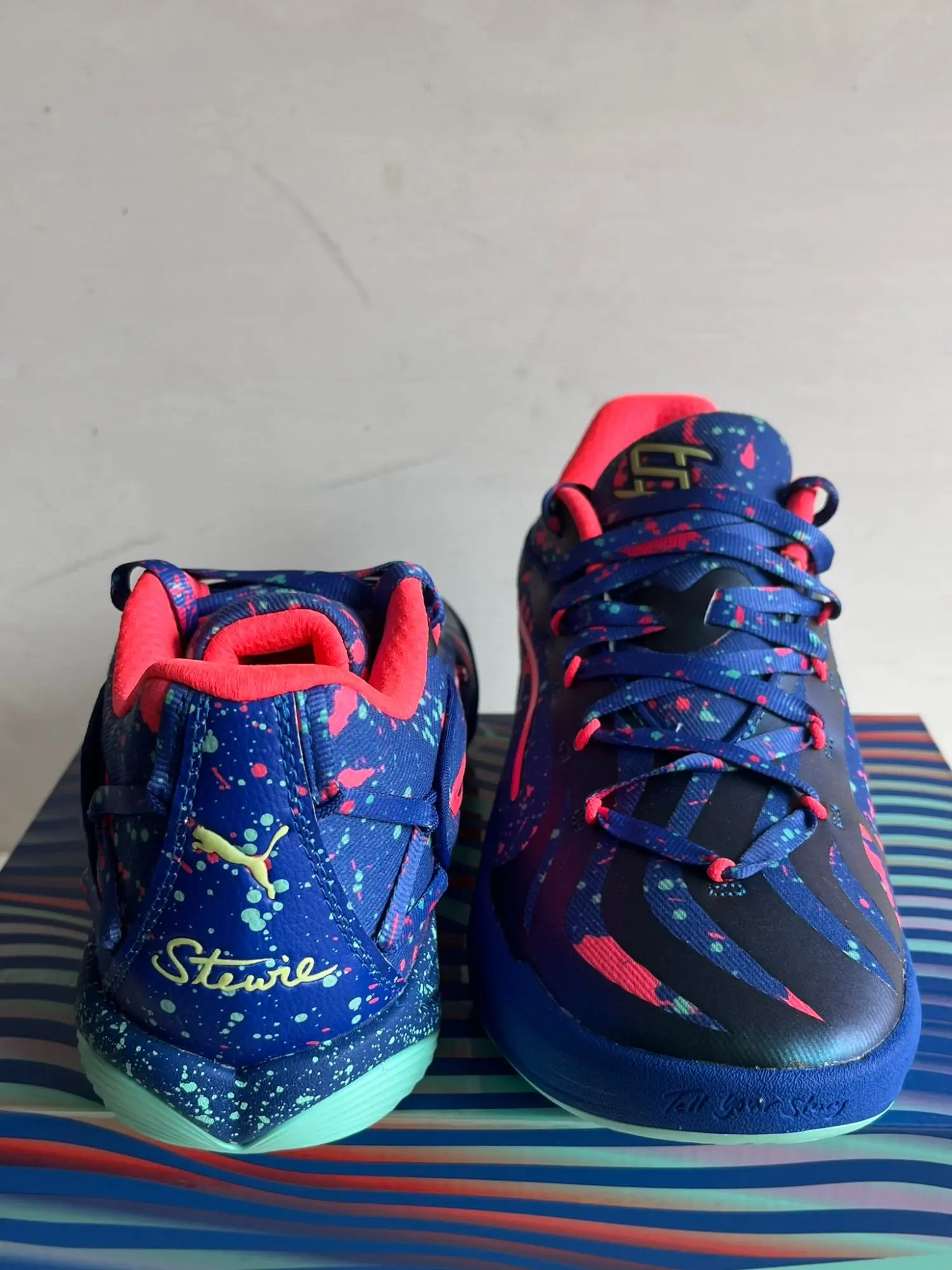 Snea­ker - Hal­len­schu­he 311497-01 Neu OVP Der PU­MA Wo­men's Ste­wie 4 Night Vi­si­on zeigt le­ben­di­ge Far­ben, in­spi­riert von dem Phä­no­men des wei­ßen Lichts, das durch ein Pris­ma ge­bro­chen wird. Farb­sprit­zer in Tür­kis und Fuch­sia be­de­cken das blaue, tech­ni­sche Me­sh-Ober­ma­te­ri­al, das mit Schnür­sen­keln ge­si­chert ist, die durch kor­dier­te Ösen ge­führt wer­den. Der Form­strip ist in Neon­pink um­ran­det, pas­send zur tex­ti­len Kra­gen­in­nen­füt­te­rung. Bre­an­na Ste­warts vier­ter Si­gna­tu­re-Schuh ruht auf ei­ner ge­spren­kel­ten PRO­FO­AM-Mit­tel­soh­le, die aus ei­ner hoch­pral­len EVA-Ver­bin­dung be­steht.