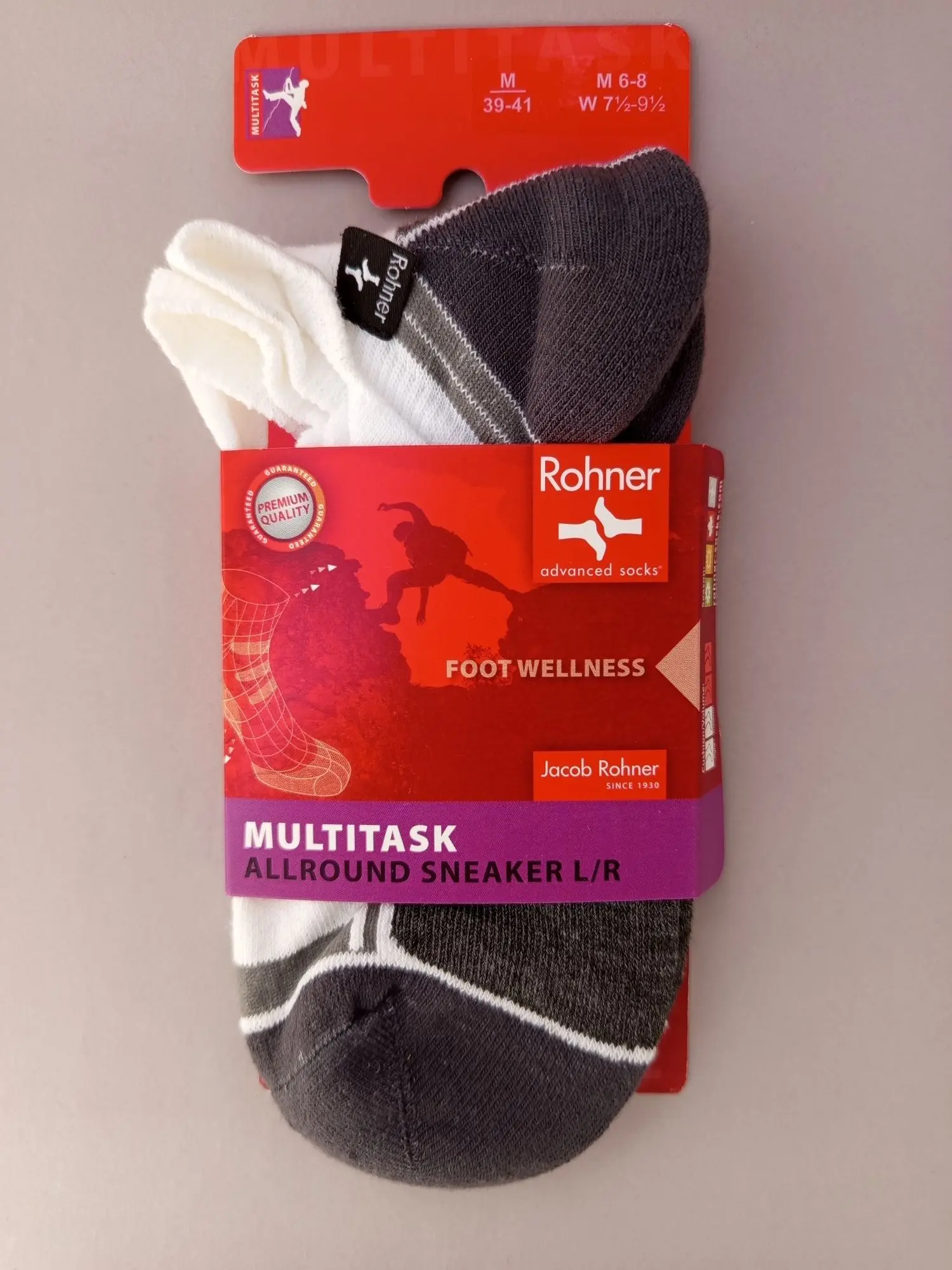 Neu OVP SOC1 Rohner ist ein Schweizer Traditionsunternehmen, das seit 1930 für erstklassige Qualität und innovative Funktionalität im Bereich hochwertiger Outdoor- und Sportsocken steht. Rohner Socken begleiten Sie im Alltag, auf Reisen und in Extremsituationen. Allround-Sneaker l/r, wie es der Name schon sagt! Ein wahrer Allrounder, egal ob im Arbeitsalltag oder im Training beim Sport. Das polsternde Frottee im Sohlenbereich wirkt stoßdämpfend und sorgt für optimalen Komfort. Durch den gerippten und weichen Abschlussrand schneidet die Socke weder ein noch verrutscht sie. Zudem sorgt die anatomische Passform für bestmöglichen Fußkomfort. Hoher Fußkomfort: Frottee im Fußsohlenbereich für Polsterung, Komfort und überragende stoßdämpfende Eigenschaften, anatomische Passform, gerippter, gepolsterter Abschlussrand, rutscht nicht und schneidet nicht ein, gekettelte Sockenspitze für einen nahtlosen Zehenbereich, um Reibung oder Reizung des Fußes zu vermeiden. Material: 36 % Polypropylen (Polycolon®), 29 % Polyamid, 27 % Polyester (Dri-Release®), 6 % Baumwolle, 2 % Elasthan (Lycra®)