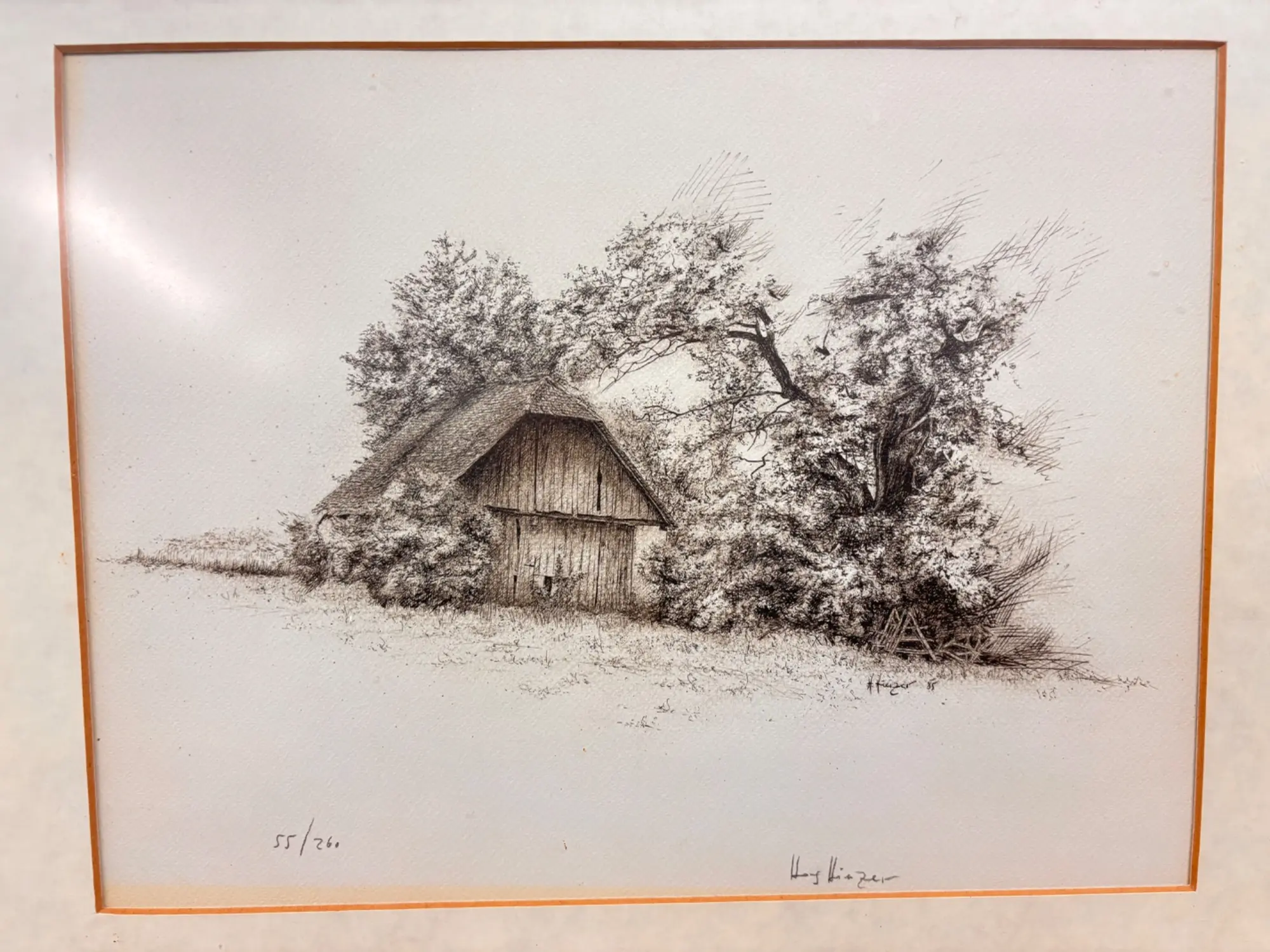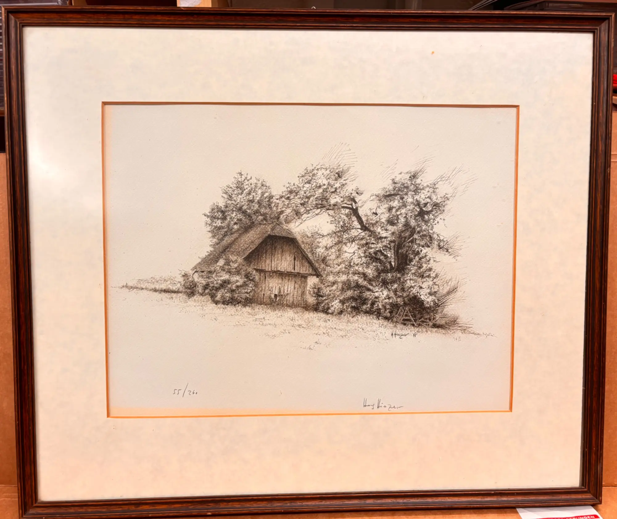 125.769: 1 Stk. Bild Bau­ern­haus 46,5 x 55 cm ca. si­gniert Nr 55 vo (2)