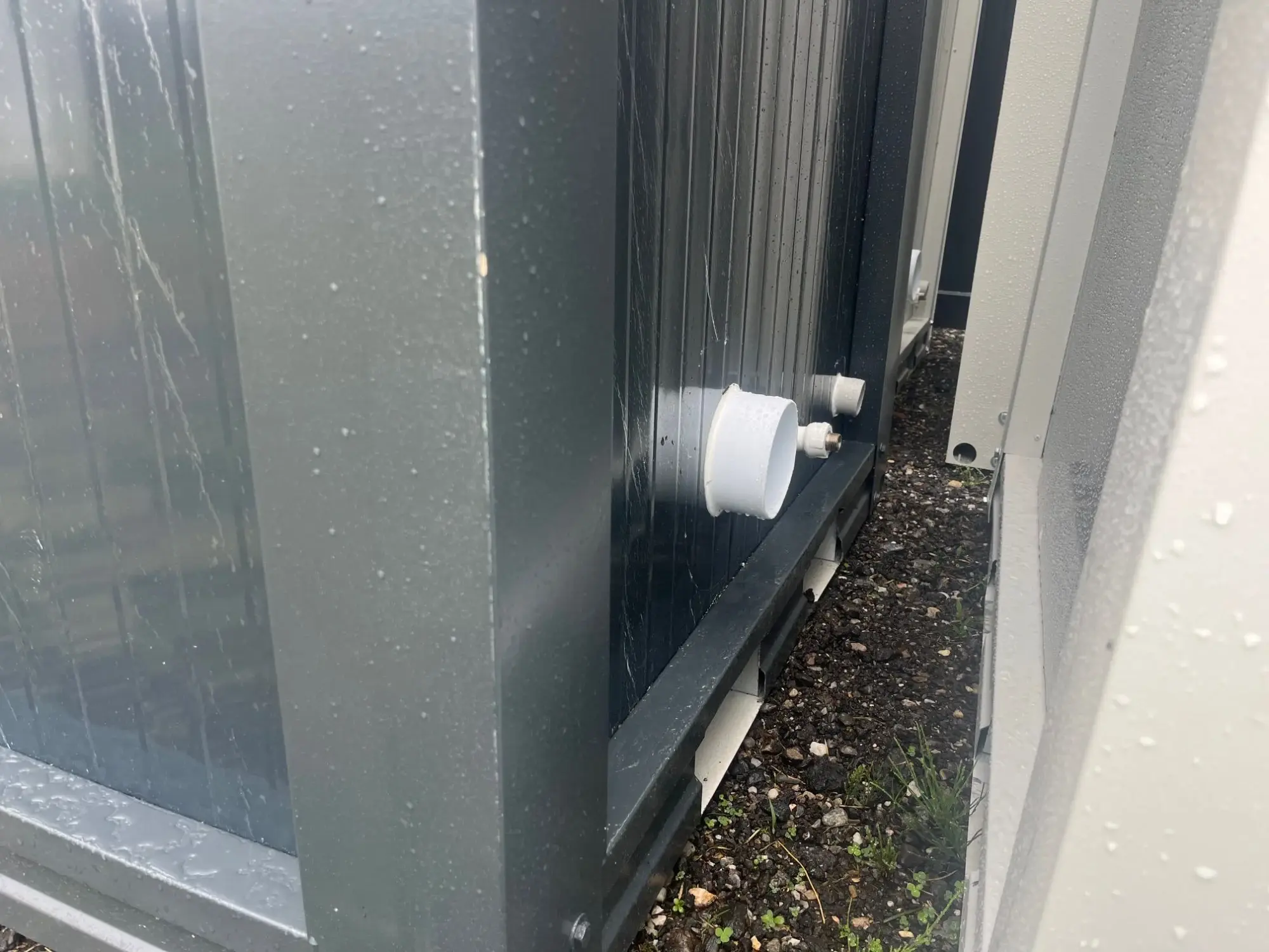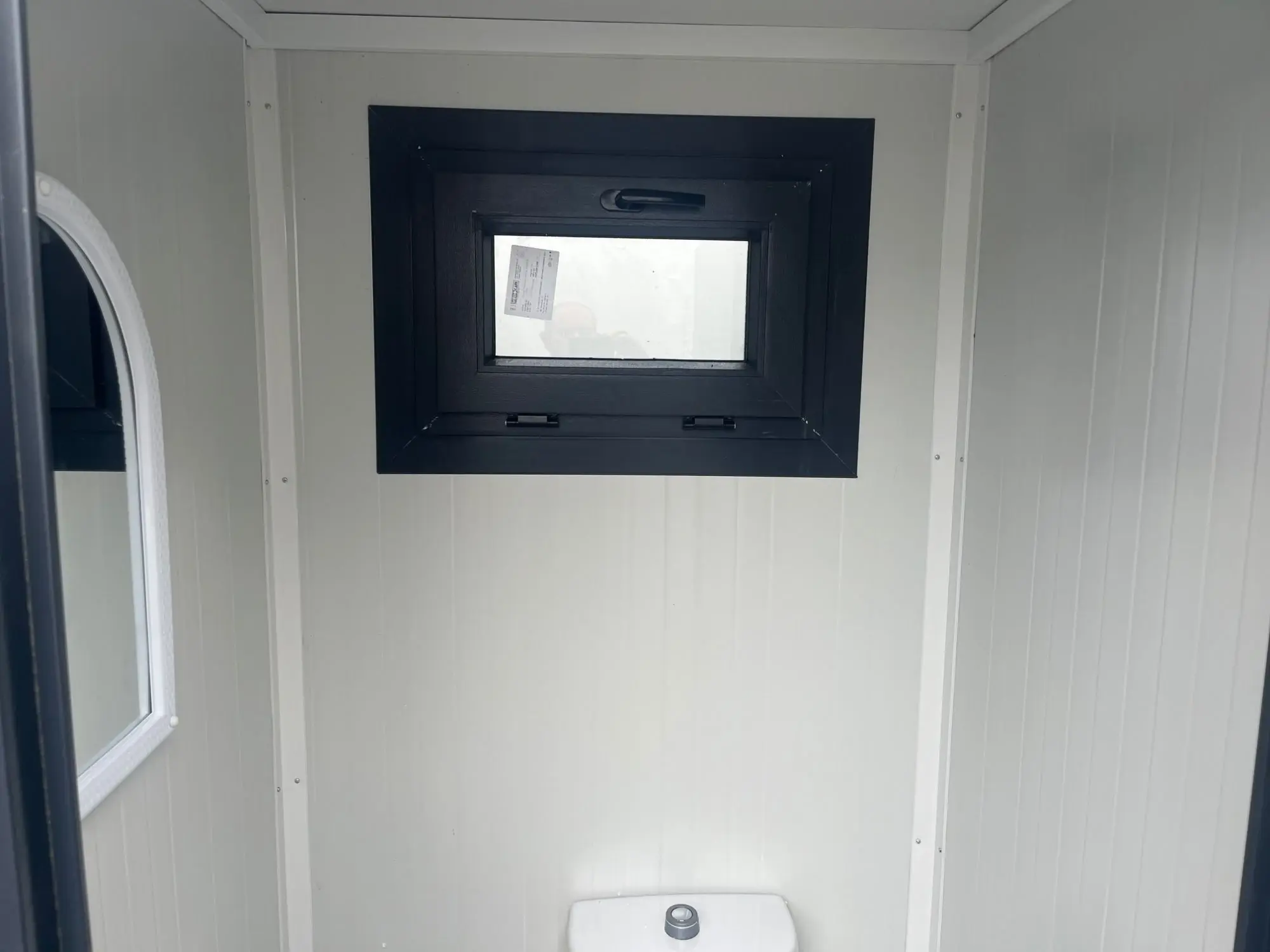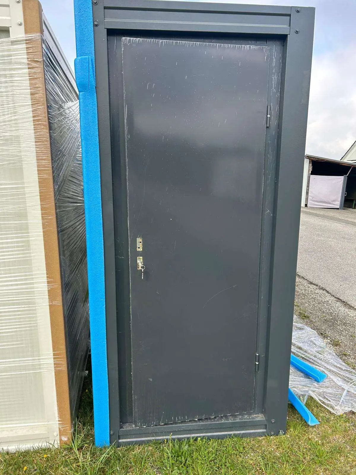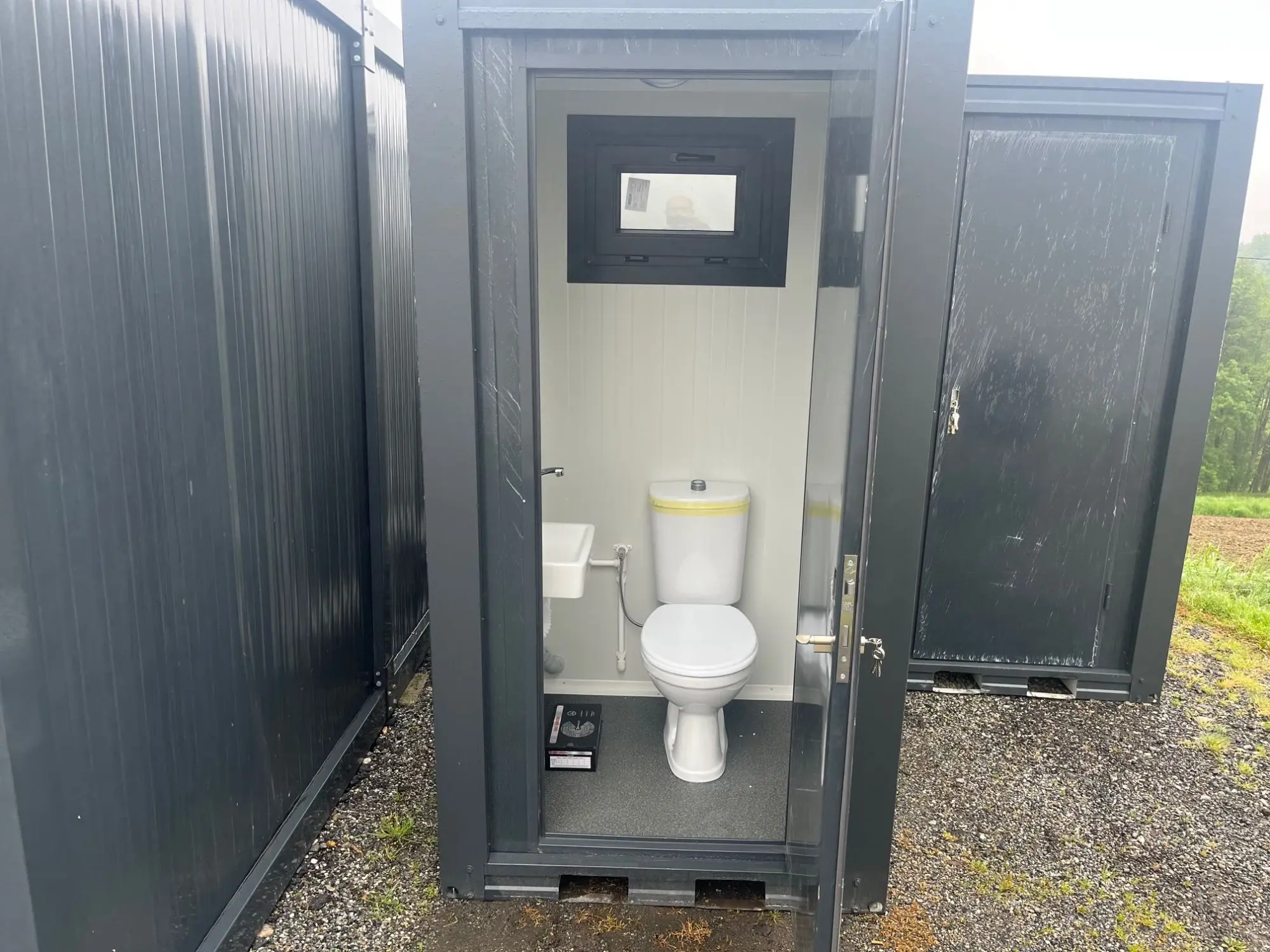 WC-Con­tai­ner, Far­be an­thra­zit, Ma­ße: 120 cm mal 110 cm mal 230 cm Hö­he, inkl. WC, Wasch­be­cken, Lam­pe, Spie­gel, Rol­len­hal­te­rung