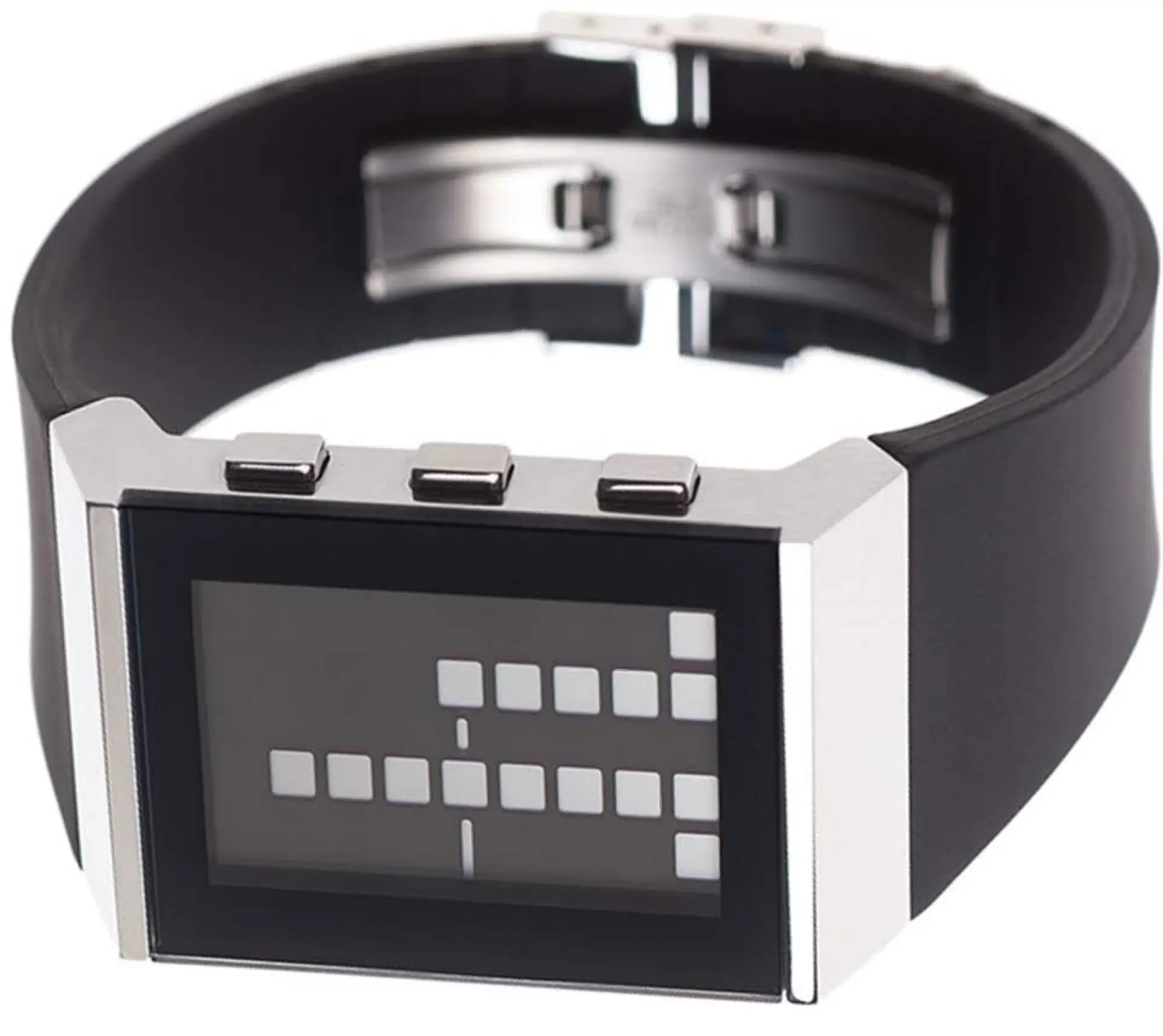 E8 Brieuc du Roscoät entwarf mit der Armbanduhr E8 WATCH ein einzigartiges Designerstück. Helle Balken auf schwarzem Grund weisen Benutzern bei dieser Armbanduhr für Damen und Herren die Zeit. Das Gehäuse der patentierten optischen Uhr ist aus robustem Stahl gefertigt, das Armband wurde aus Silikon konzipiert, was eine Langlebigkeit der Armbanduhr verspricht. Auf dem hinterleuchteten LCD-Display finden Sie zudem eine Datumsanzeige sowie die Alarmfunktion verzeichnet. Die Armbanduhr E8 WATCH ist weiterhin bis 3 Atmosphären wasserresistent. Kaufen Sie diese Armbanduhr, wenn Sie eine nur 175-g-leichte Orientierungshilfe am Handgelenk suchen. Die Armbanduhr E8 WATCH wird mit erneuerter Varta-Batterie geliefert. Anhand der Blöcke auf der Uhr errechnet man die aktuelle Uhrzeit. Diese revolutionäre Designer-Uhr hat nicht nur einen einzigartigen Sinn und zeitgenössischen Stil, sondern ist auch noch ein toller Gesprächsstarter. Chrom-Finish - patentierte optische Lesung Watch - hintergrundbeleuchtete LCD