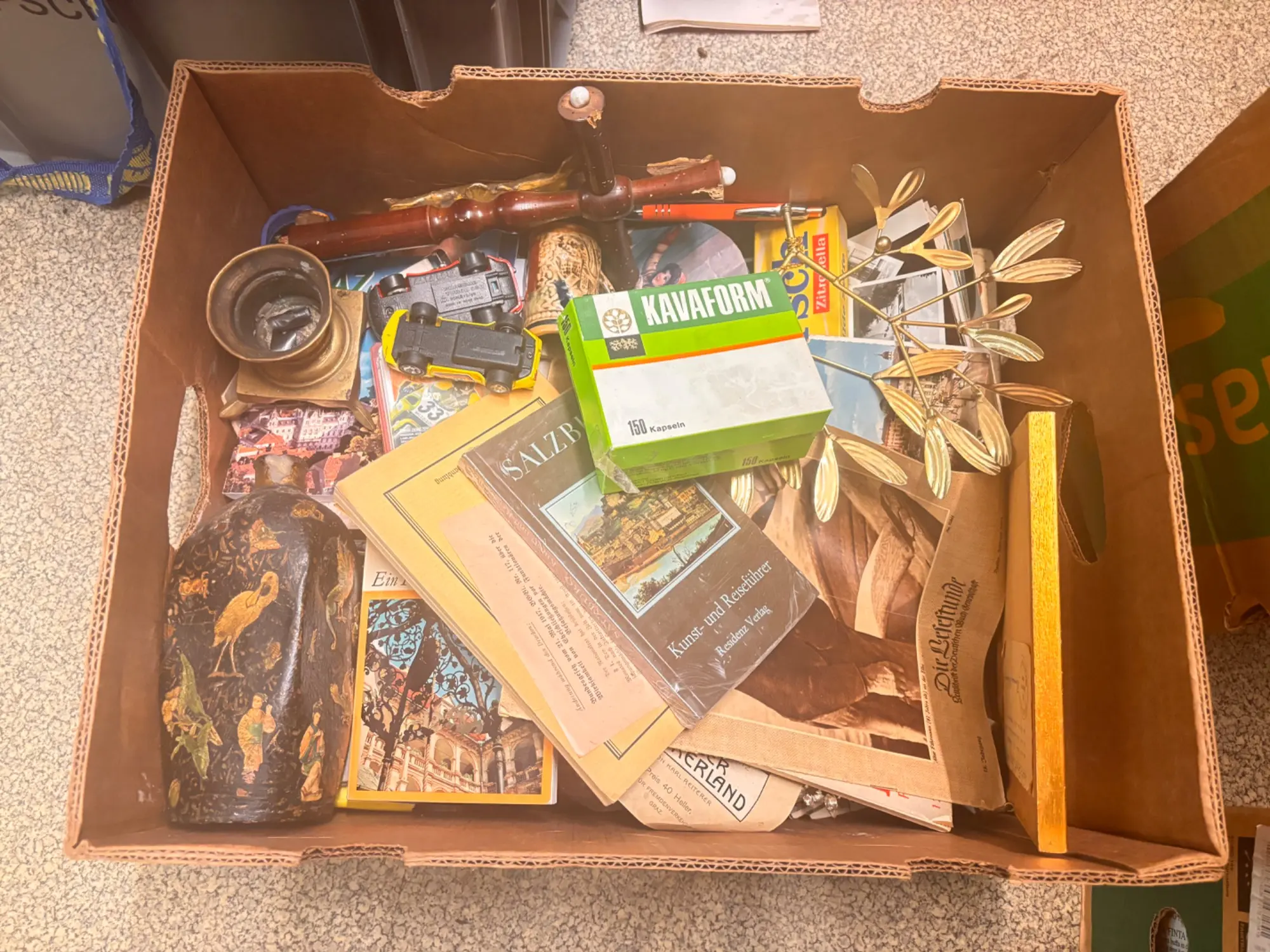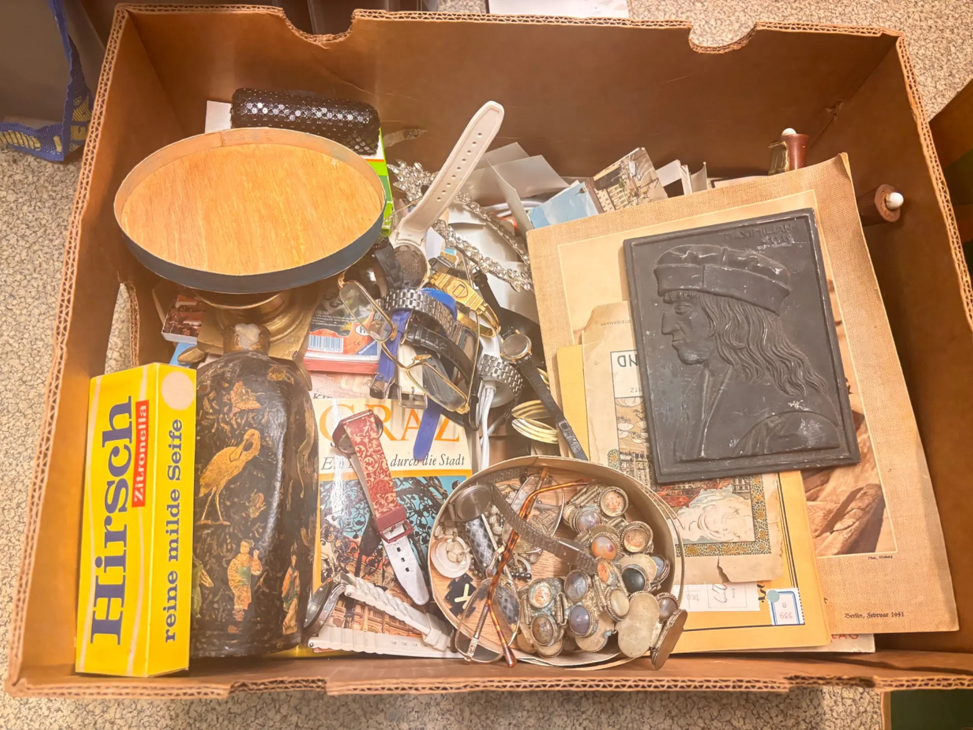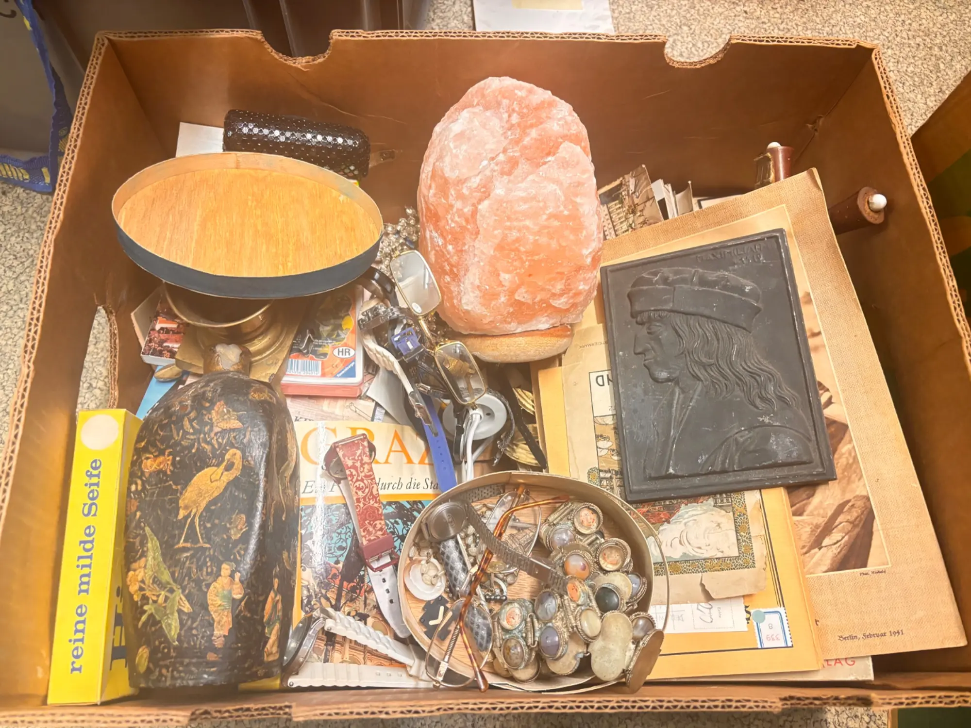 125.807: 1 Karton Villafund Krimskrams Kiste: Bild, Fotos, alte Vase