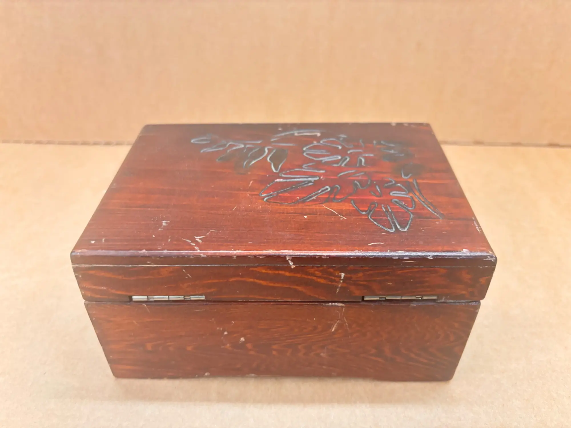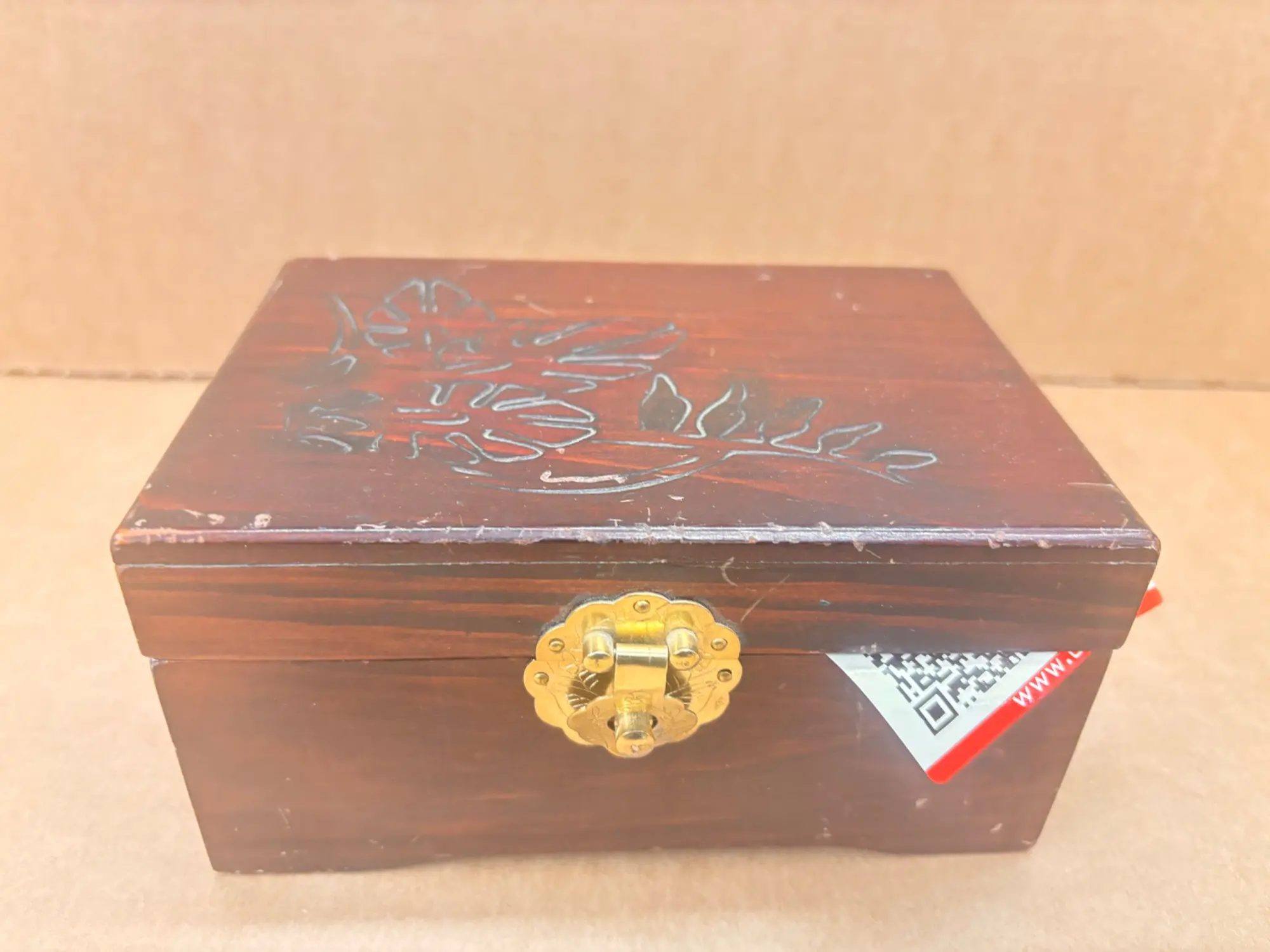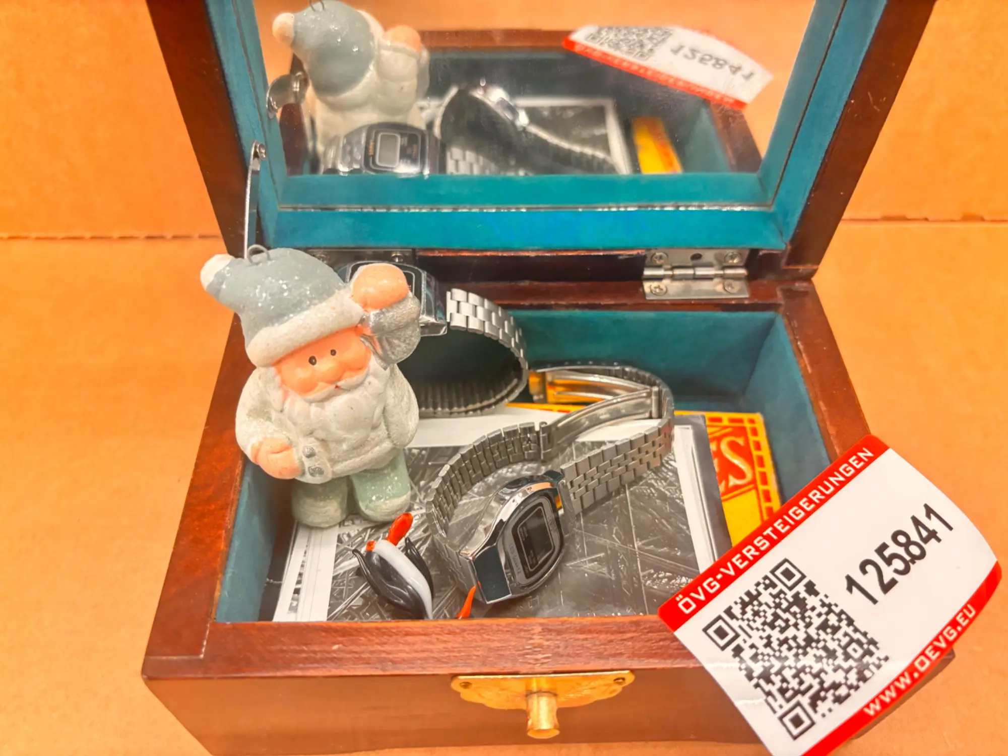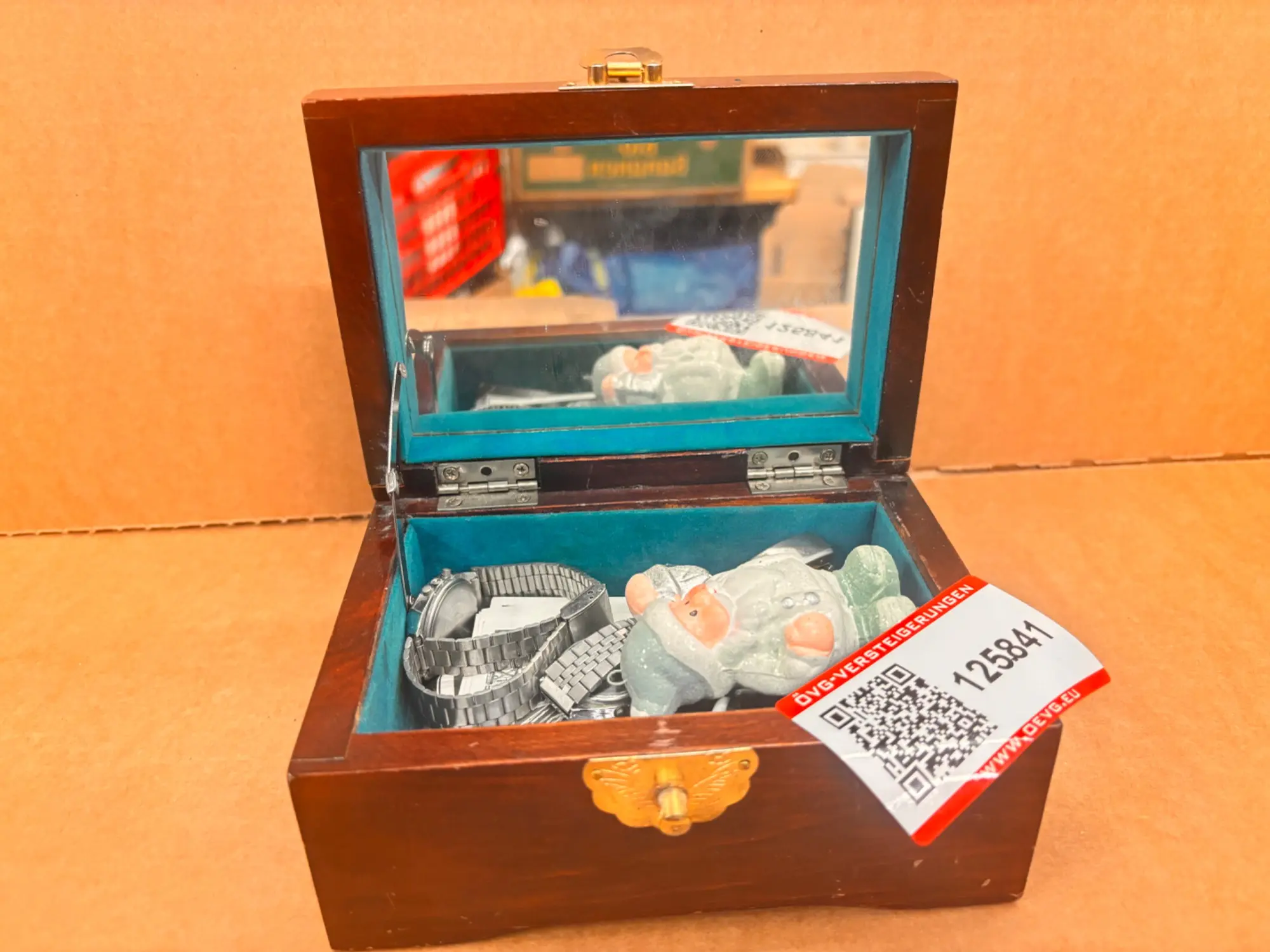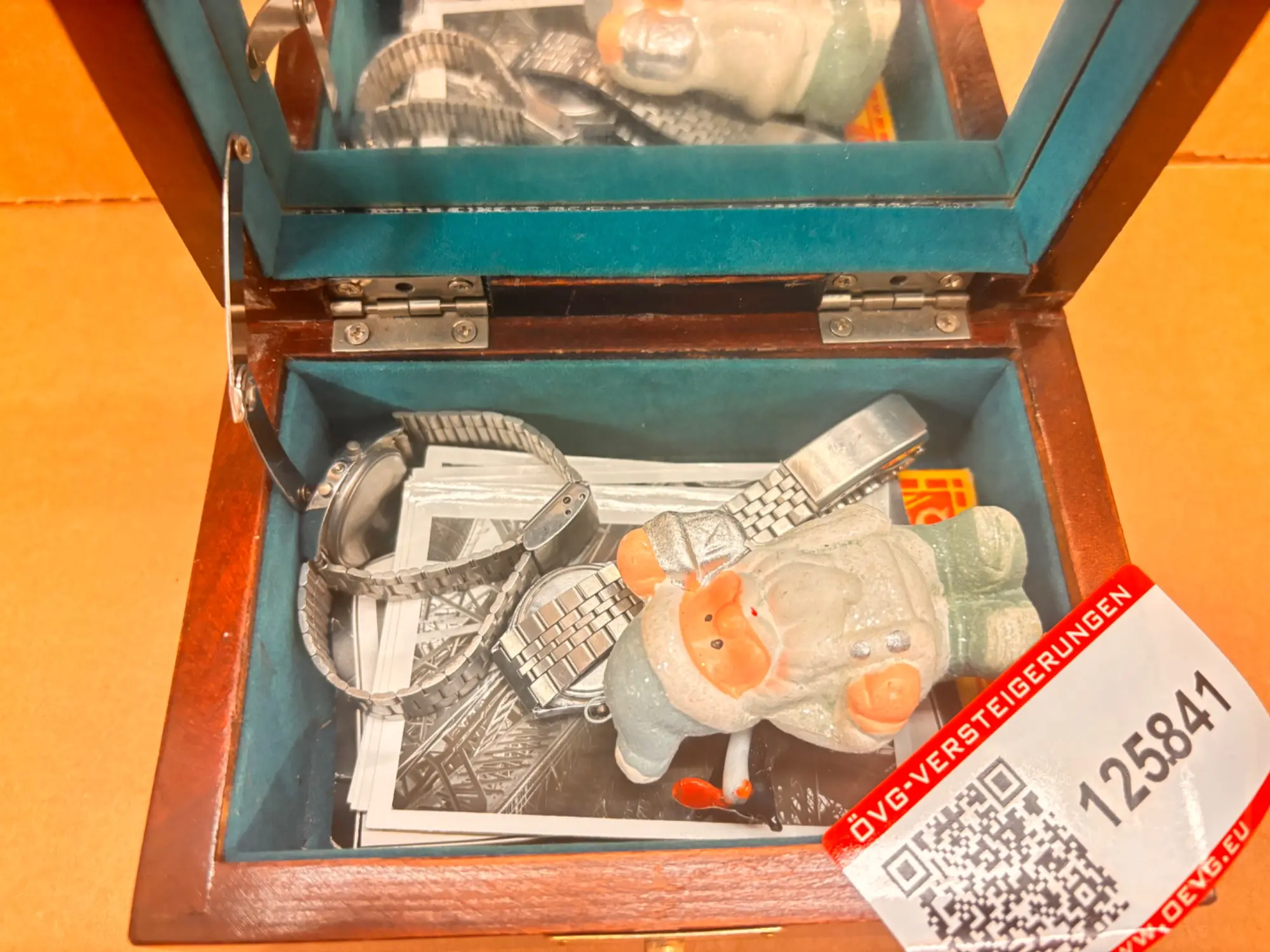125.841: 1 Stk. Holzkisterl mit Uhren, Fotos, Diversem.